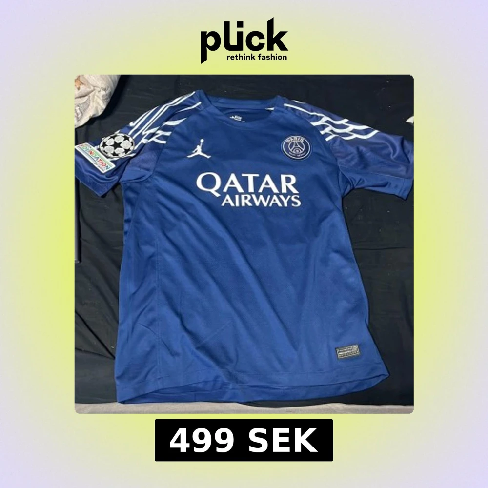 Blå PSG x Jordan fotbollströja med D.Doué 14 på ryggen. Tröjan har vita detaljer, Champions League-märke på ärmen och Qatar Airways-tryck på bröstet. Tillverkad i Dri-FIT-material som andas. Snygga vita mönster på axlarna och klassisk passform.