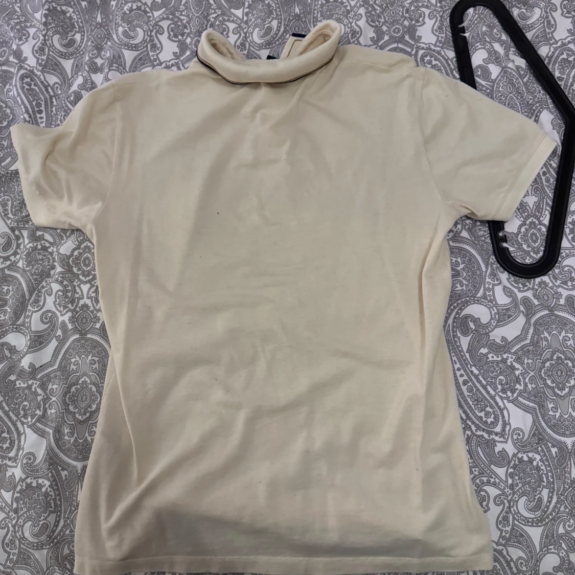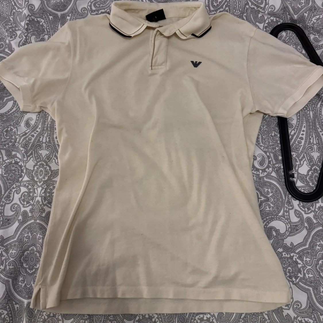 Säljer en klassisk vit pikétröja från Emporio Armani med korta ärmar och liten logga på bröstet. Tröjan har krage med svarta och vita ränder och knäppning vid halsen. Perfekt för en stilren look.
