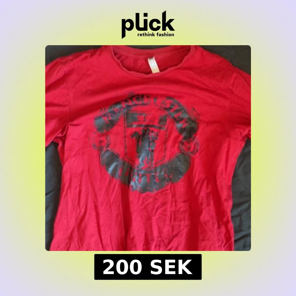 Säljer en röd t-shirt med Manchester United-logga i svart på framsidan. Perfekt för fotbollsfans som vill visa sitt stöd för laget. T-shirten har en klassisk passform och korta ärmar.