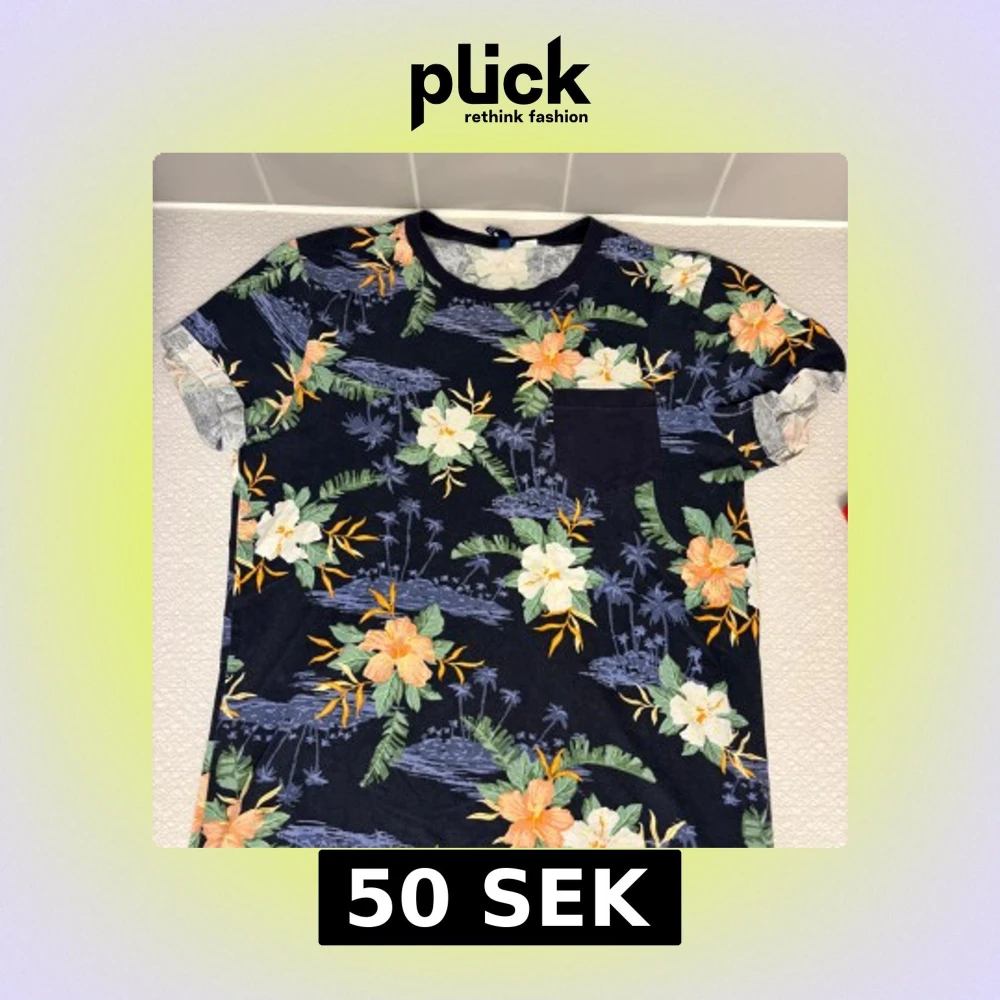 Snygg t-shirt med tropiskt blommönster i grönt, vitt, orange och gult på mörkblå botten. T-shirten har korta ärmar, rund halsringning och en mörkblå bröstficka. Perfekt för en chill och färgglad stil.