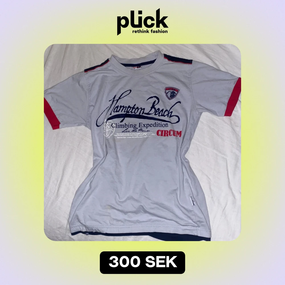 Snygg vit t-shirt från Hampton Beach med blått och rött tryck framtill. Den är ganska kort i magen och går under naveln precis, ungefär i storlek s/sx runt nacken o ärmarna. 🫶‼️