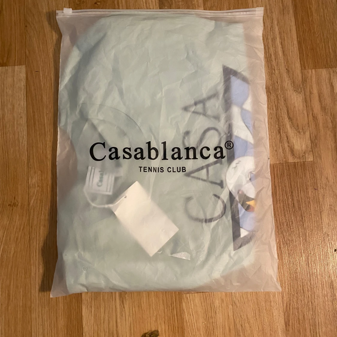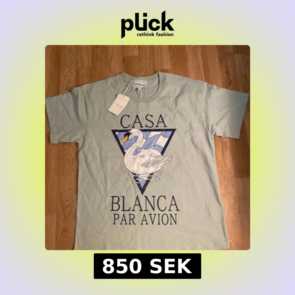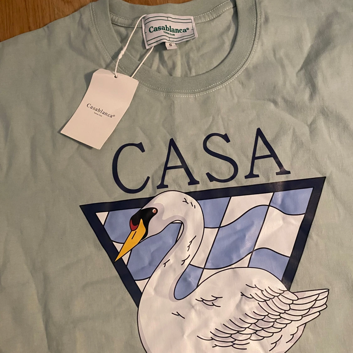 Casablanca t-shirt i ljusblått med stor grafisk print framtill av en svan och texten 'Casa Blanca Par Avion'. Klassisk passform, rund hals och korta ärmar. Tillverkad i mjuk bomull, perfekt för en chill och stilren look.
