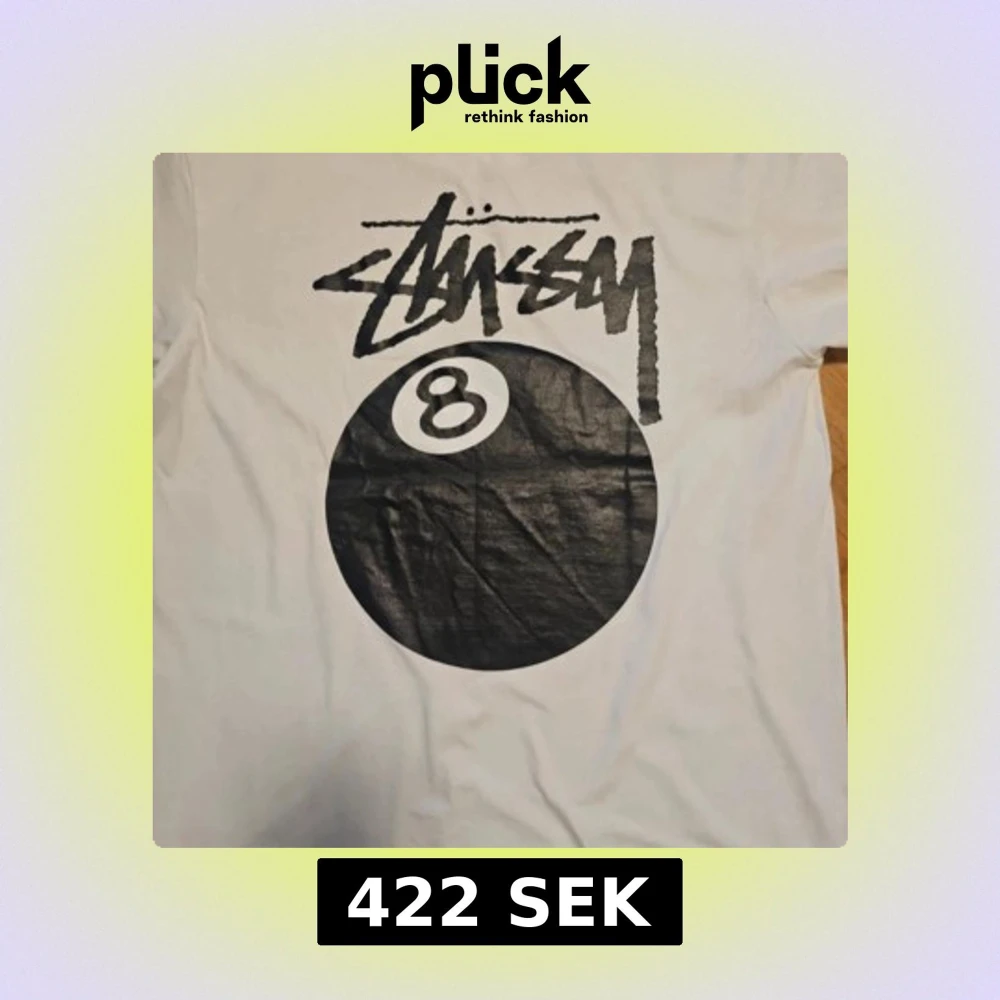 Vit t-shirt från Stüssy med stort svart 8-ball tryck och Stüssy-logga på ryggen samt mindre print på bröstet. Klassisk passform och rund hals. Perfekt för dig som gillar streetwear och vill sticka ut med en ikonisk design.