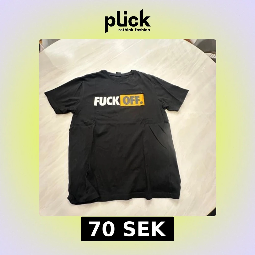 Svart t-shirt med stort tryck på bröstet där det står 'FUCK OFF.' i vitt och gult. Klassisk passform och rund halsringning. Perfekt för dig som vill sticka ut med en kaxig stil.