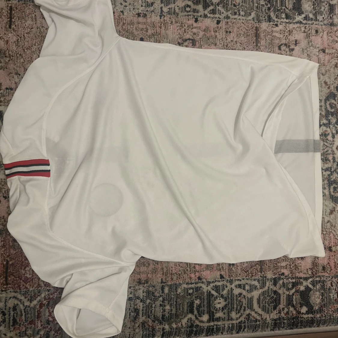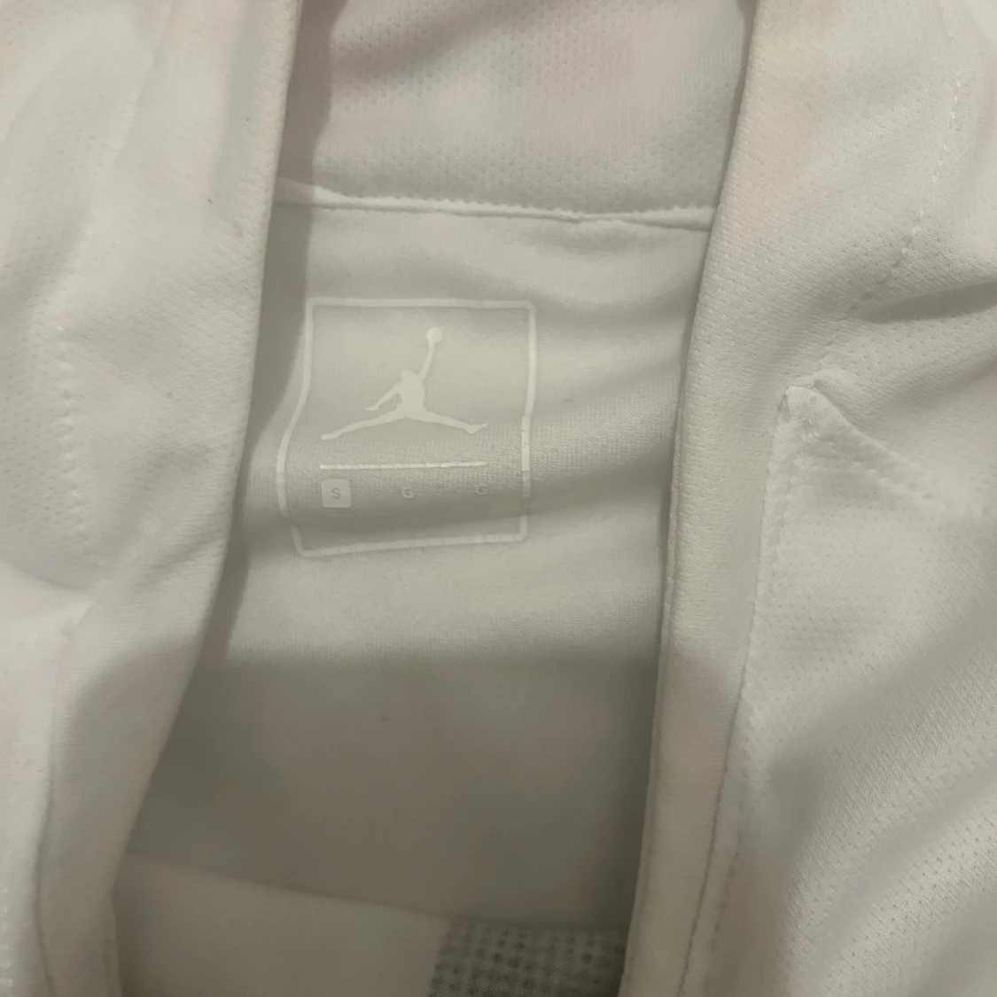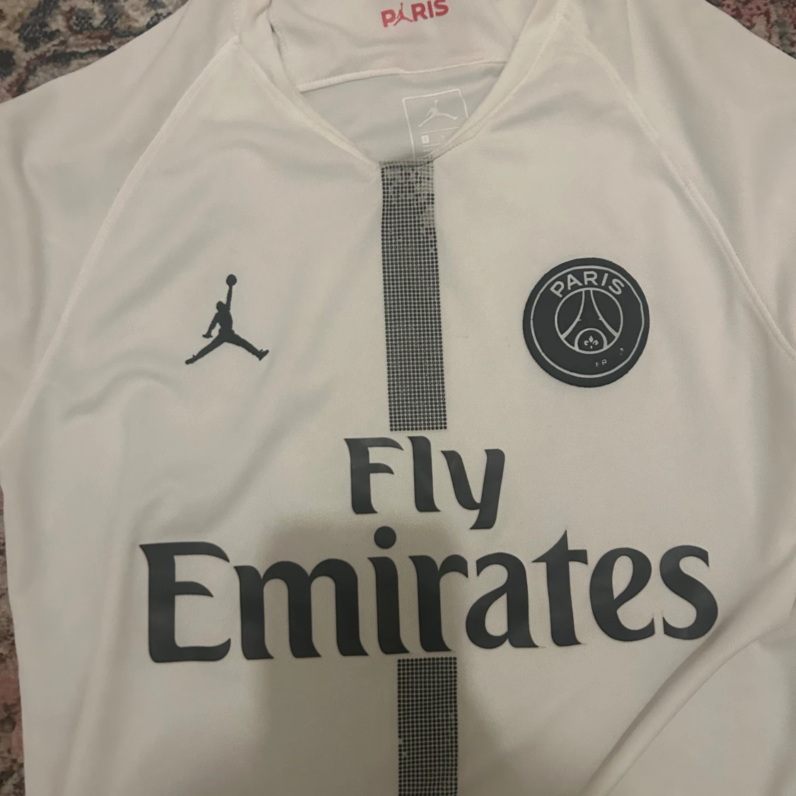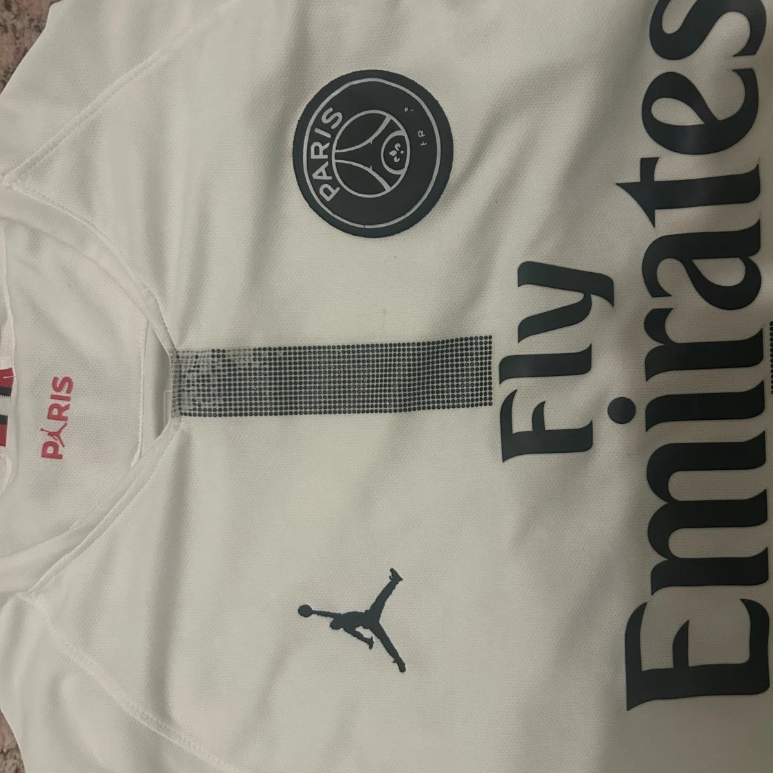 Snygg vit PSG fotbollströja från Jordan med svart Paris-emblem och Fly Emirates-tryck på bröstet. Tröjan har en svart randig detalj i mitten och korta ärmar. Materialet är lätt och andas, perfekt för match eller träning. Röd och blå rand på insidan av kragen.