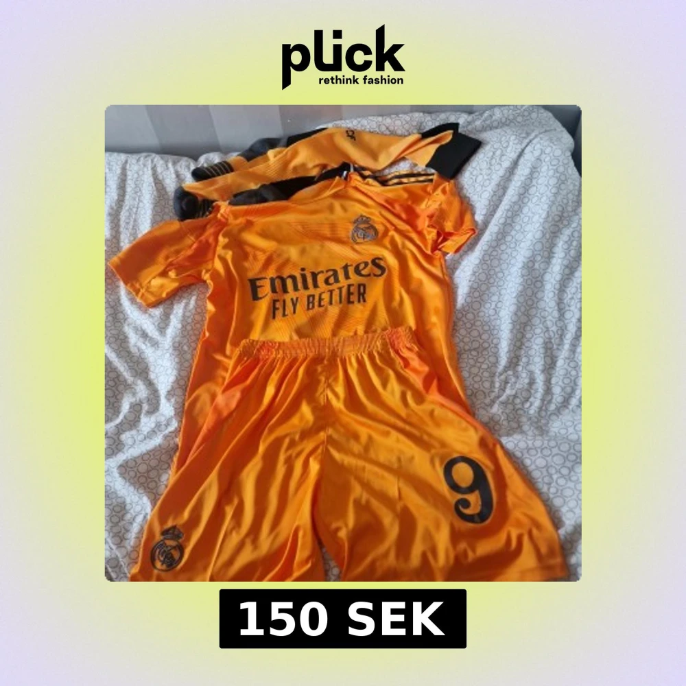 Säljer en orange Real Madrid fotbollströja med Mbappé och nummer 9 på ryggen. Setet inkluderar matchande shorts och strumpor. Tröjan har korta ärmar framtill och långa ärmar baktill, med svarta detaljer och klubbmärke på bröstet. Materialet är lätt och andas, perfekt för fotboll.