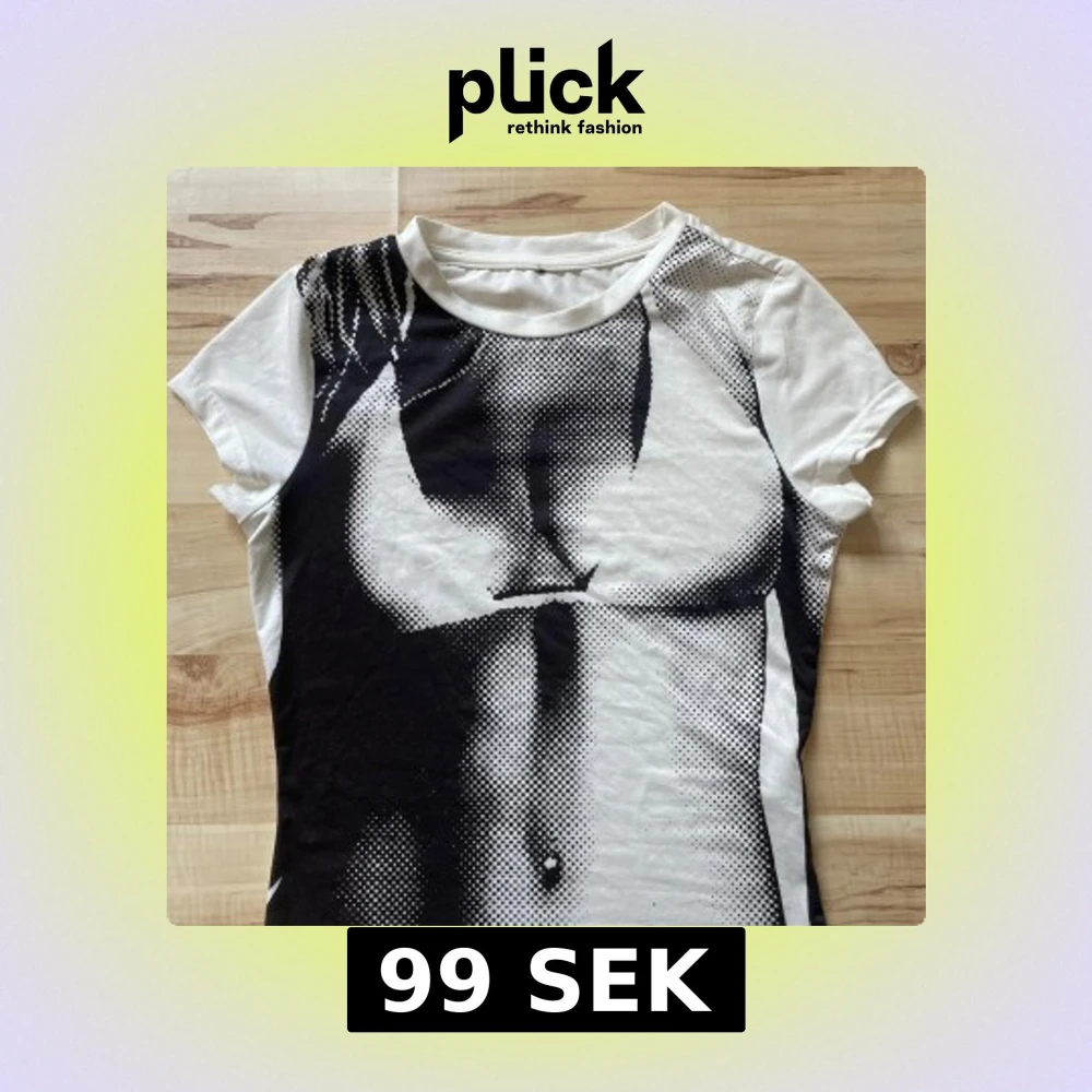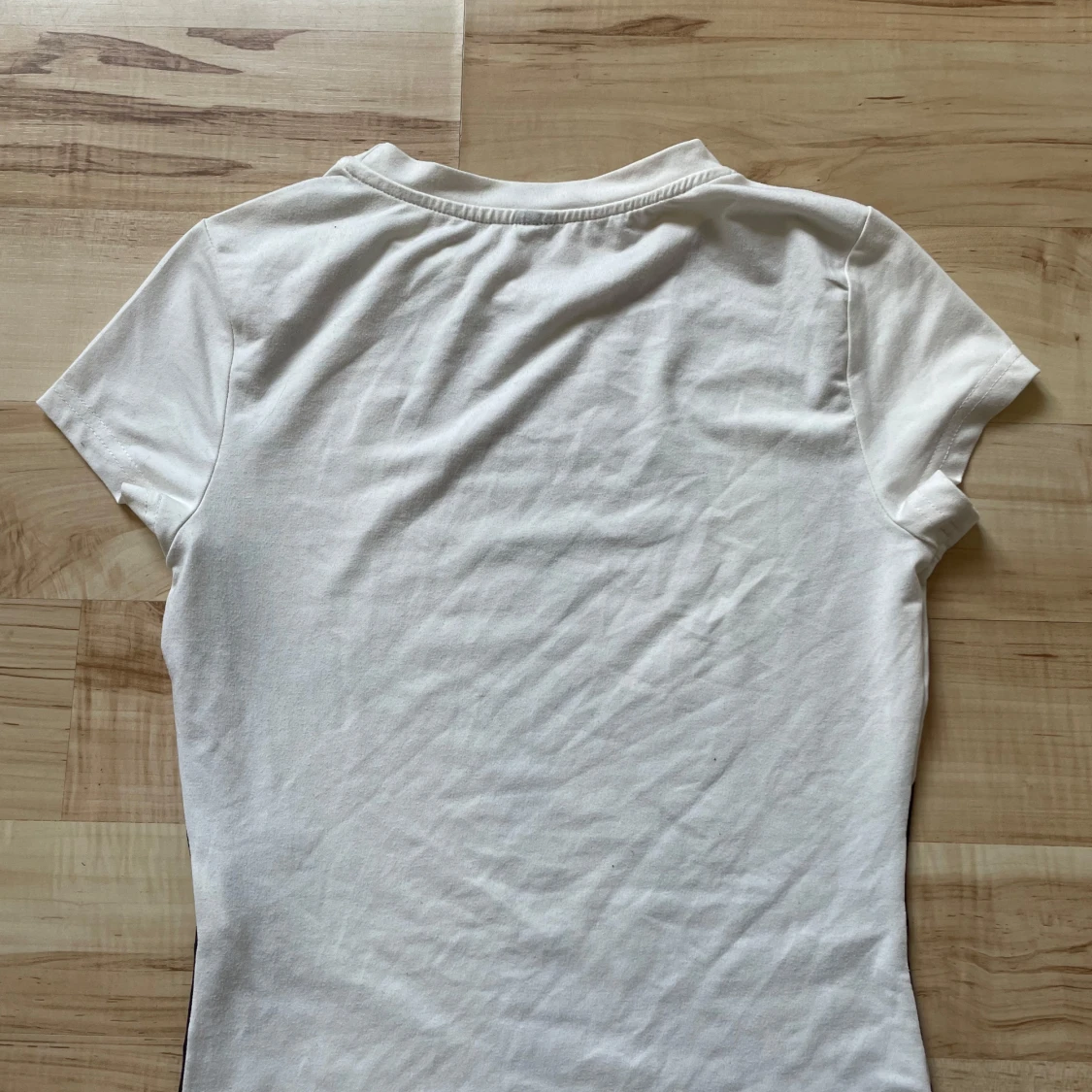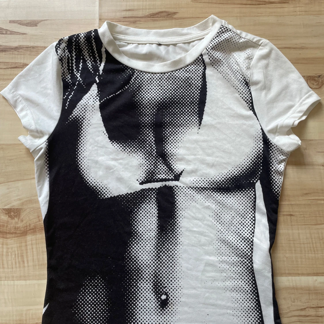 Säljer en cool vit t-shirt med ett svart tryck som täcker framsidan. T-shirten har korta ärmar och en rund halsringning. Perfekt för en unik och stilren look.