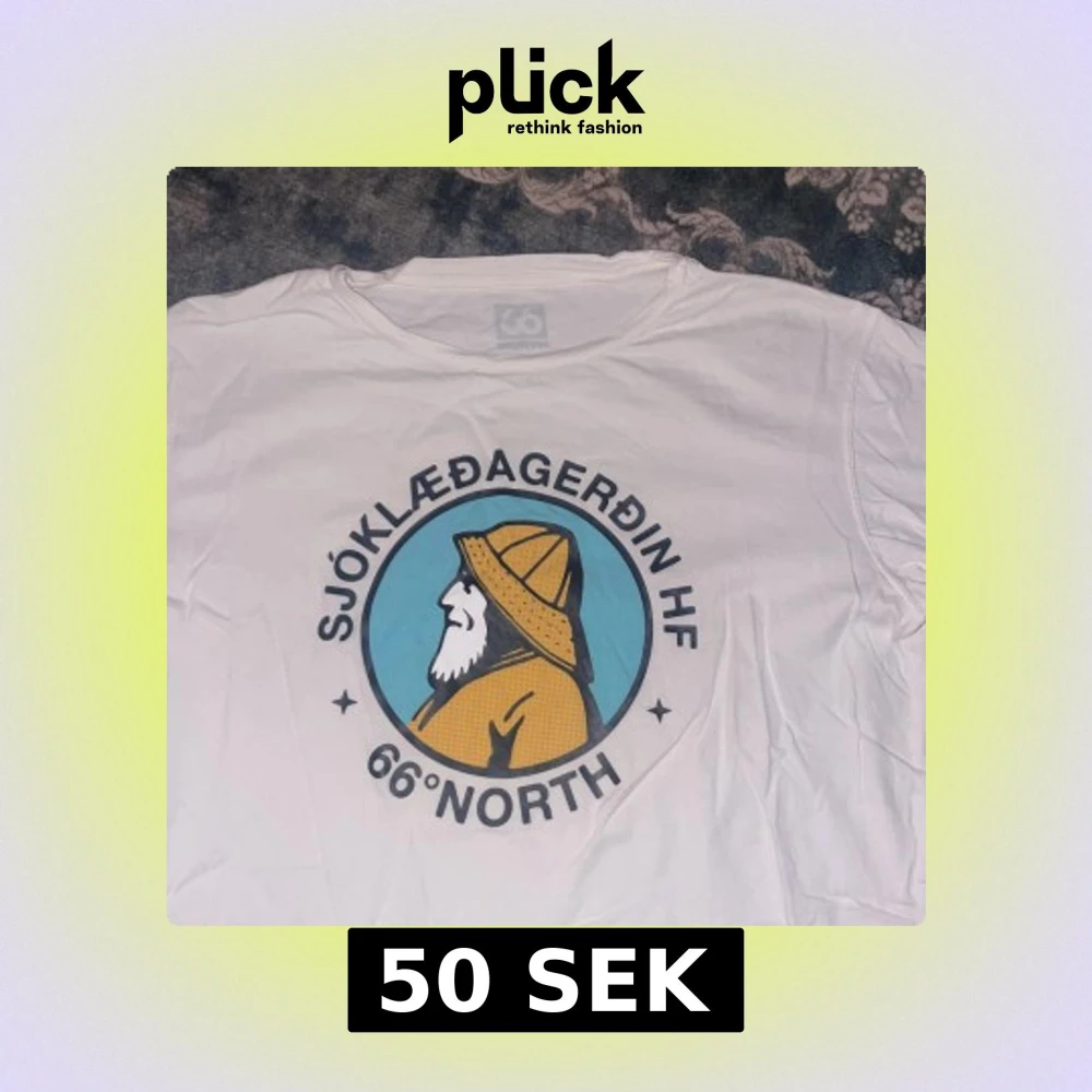 Säljer en vit t-shirt från 66°North i storlek S med ett stort grafiskt tryck på bröstet som visar en profil av en fiskare i gul regnjacka och hatt. Rund hals och korta ärmar. Perfekt för dig som gillar coola prints och islandsvibbar.