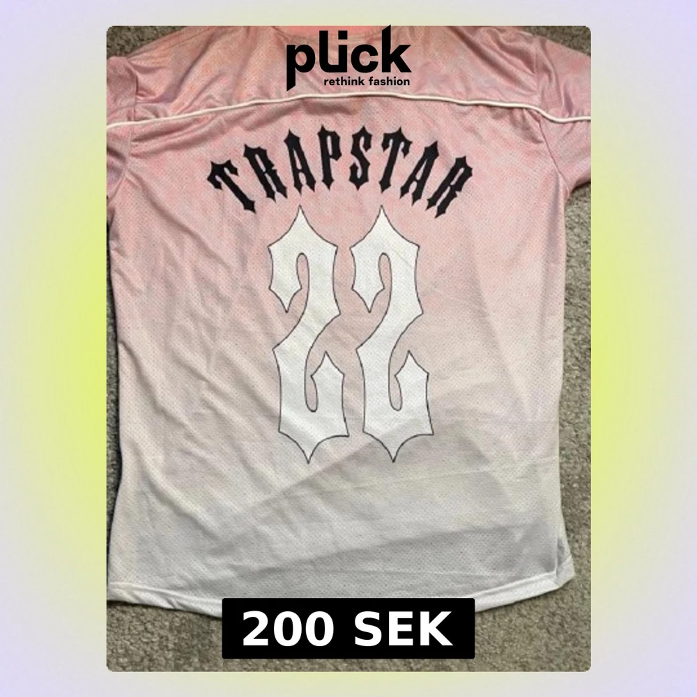 Säljer en rosa och vit mesh t-shirt från Trapstar med tryck både fram och bak. På framsidan står det 'Trapstar It's a Secret' och på baksidan finns siffran 22 i stor stil. T-shirten har korta ärmar och sportig vibe.