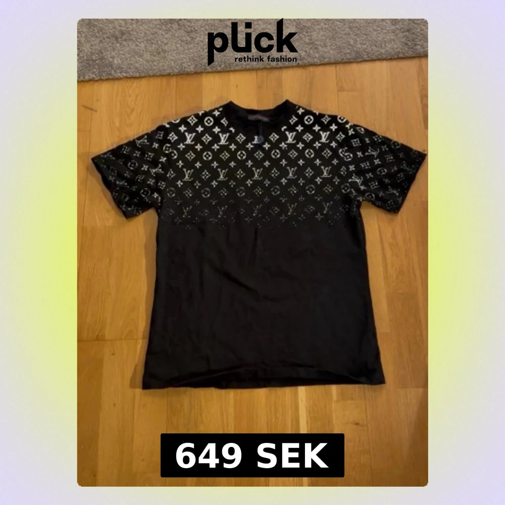 Säljer en svart t-shirt med klassiskt monogrammönster i vitt över axlar och bröst. T-shirten har rund hals, korta ärmar och är tillverkad i mjuk bomull. Perfekt för dig som vill ha en statement piece i garderoben.