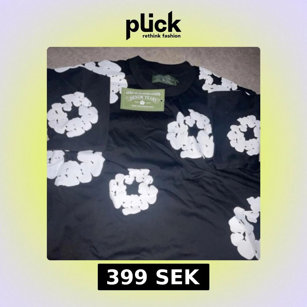 Svart t-shirt från Denim Tears med stora vita blommiga tryck över hela plagget. Klassisk rund hals och korta ärmar. Skön och stilren, perfekt för dig som vill sticka ut med en unik design.