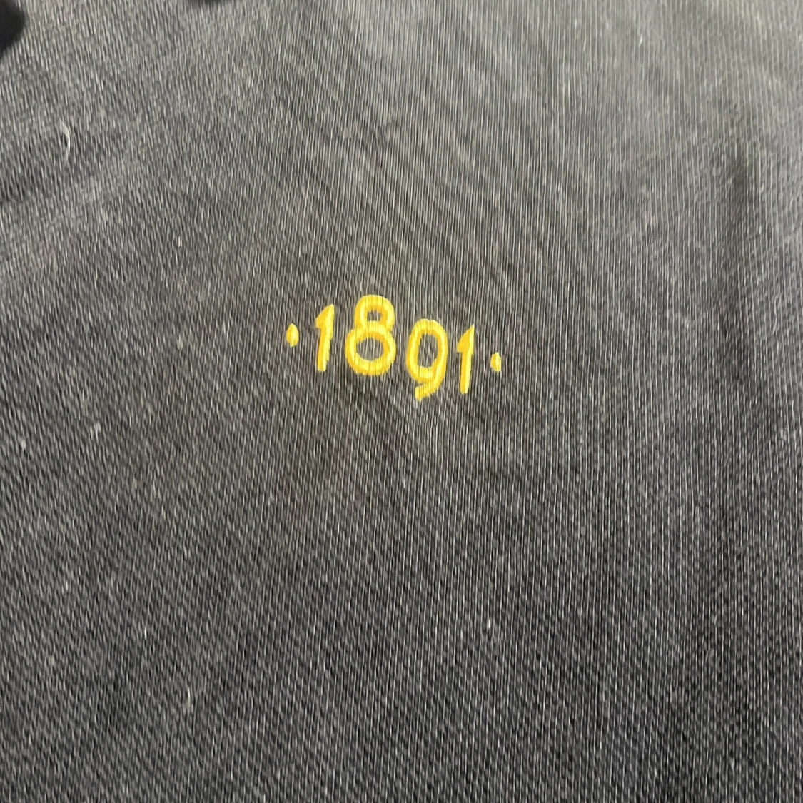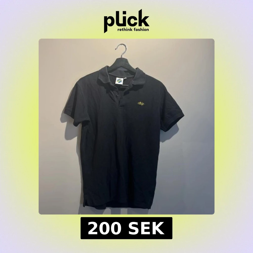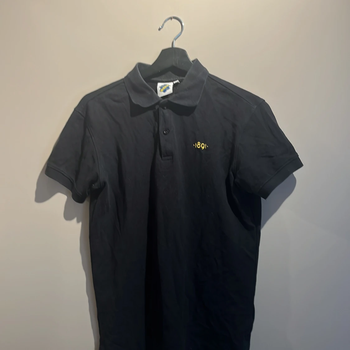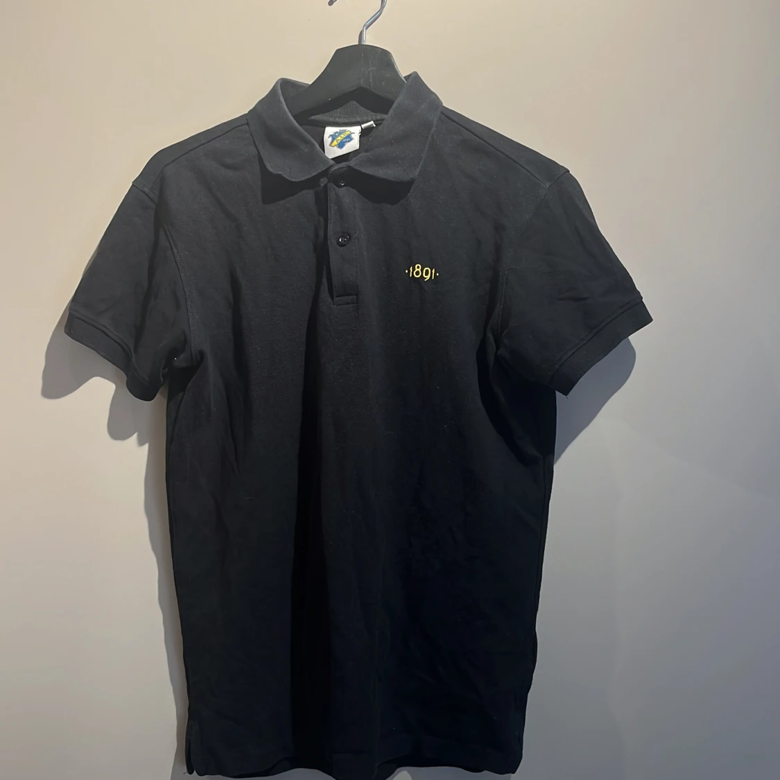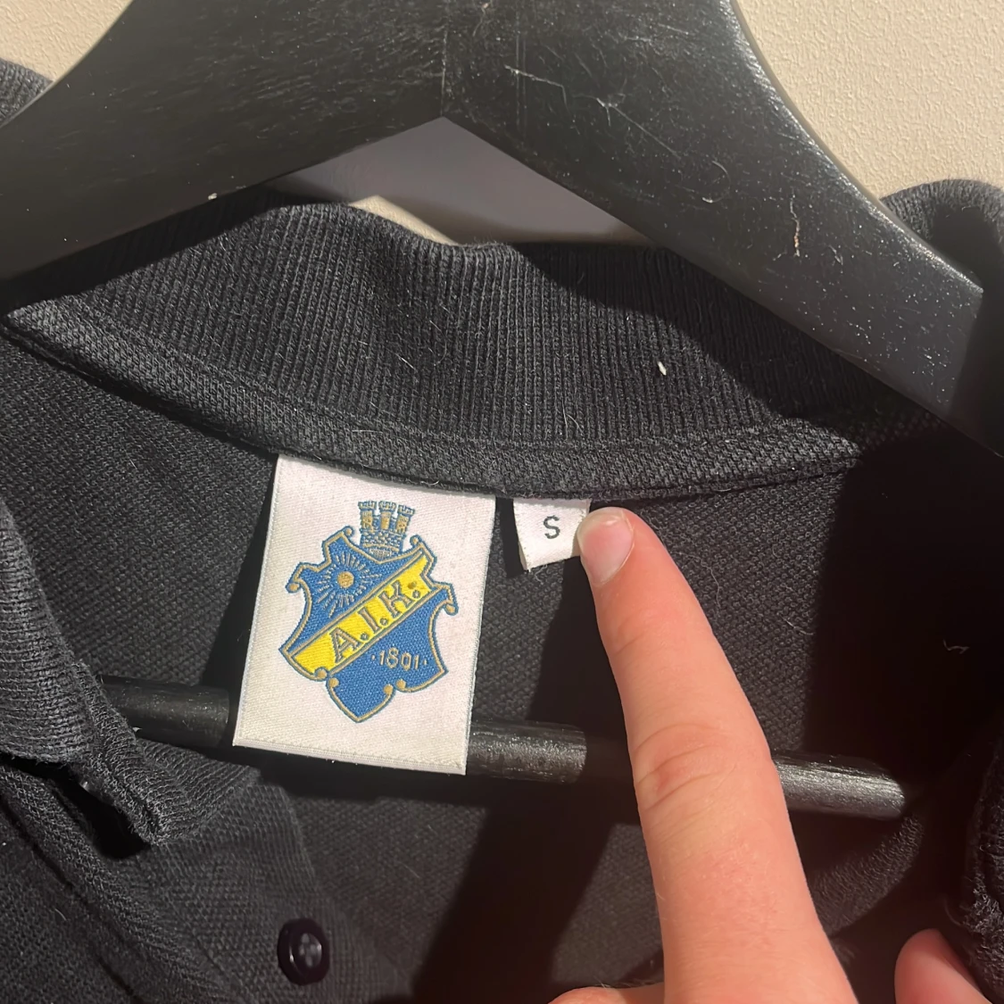 Svart pikétröja från AIK i storlek S med klassisk krage och knappar. Broderad gul text '1891' på bröstet. Perfekt för dig som vill visa ditt AIK-stöd med stil. Skön och enkel att bära, passar till jeans eller shorts.