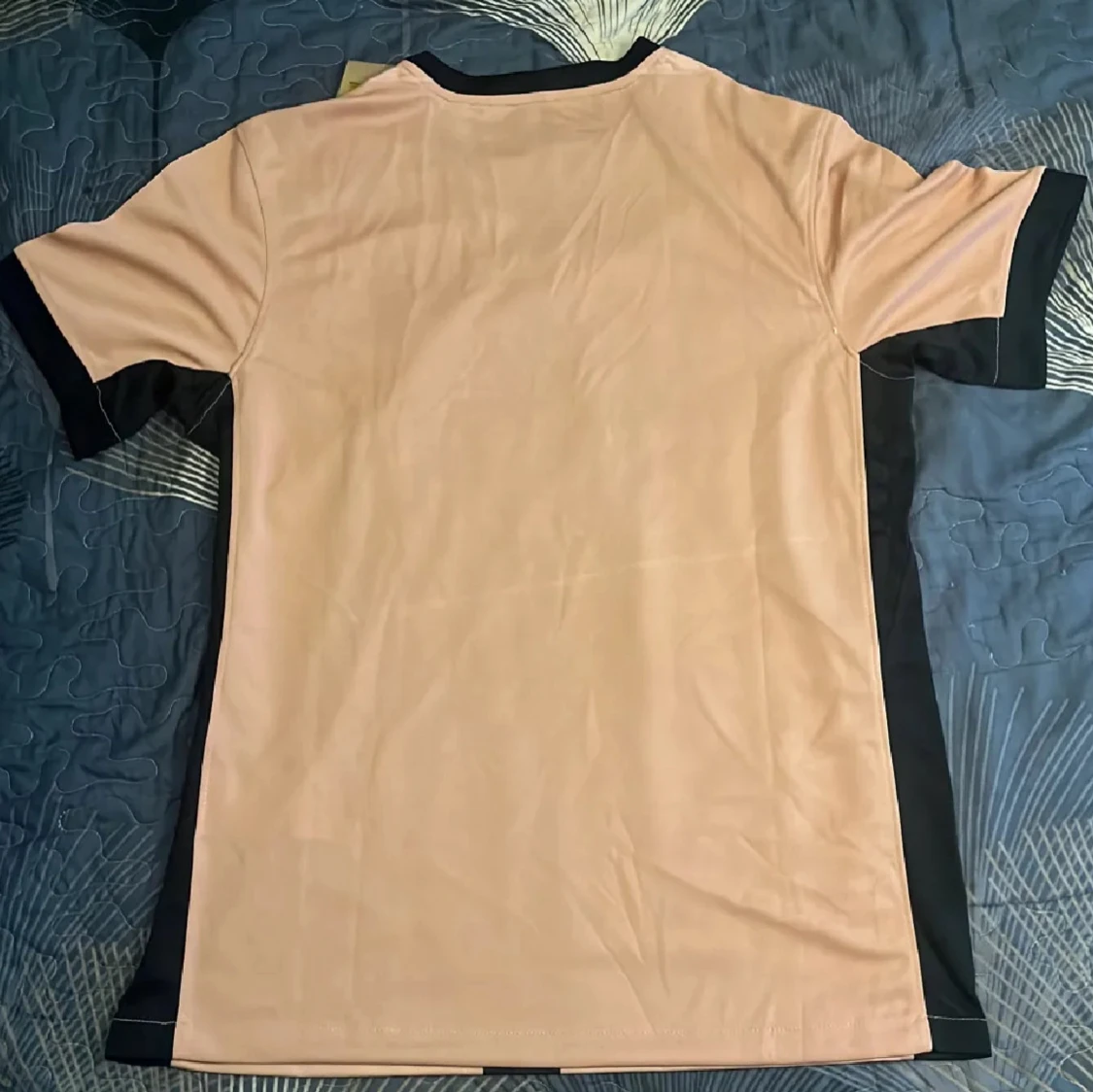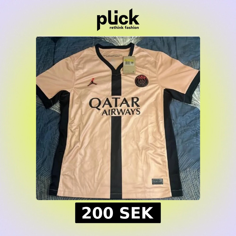Snygg PSG fotbollströja i ljusrosa med svarta detaljer och vertikal rand framtill. Tröjan har korta ärmar, svart V-ringad krage och Paris Saint-Germain-logga på bröstet. Tillverkad i lätt och ventilerande polyester, perfekt för match eller träning.