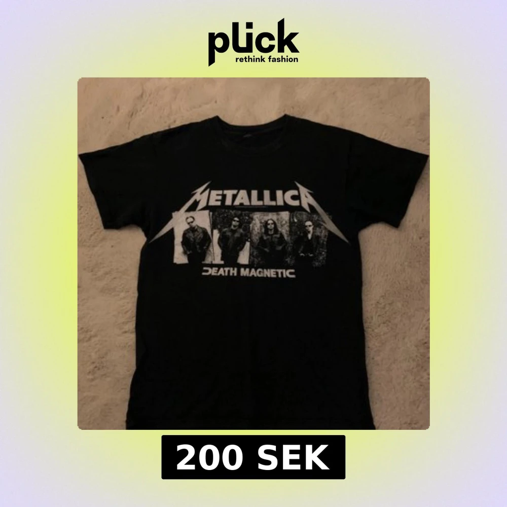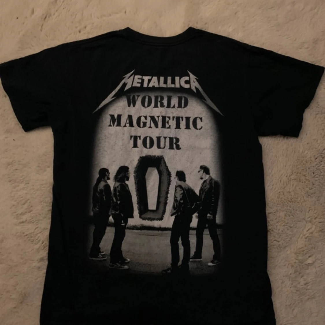 Cool svart T-shirt med Metallica 'Death Magnetic' tryck på framsidan och 'World Magnetic Tour' motiv på baksidan. Perfekt för fans av bandet som vill visa sin kärlek till musiken.