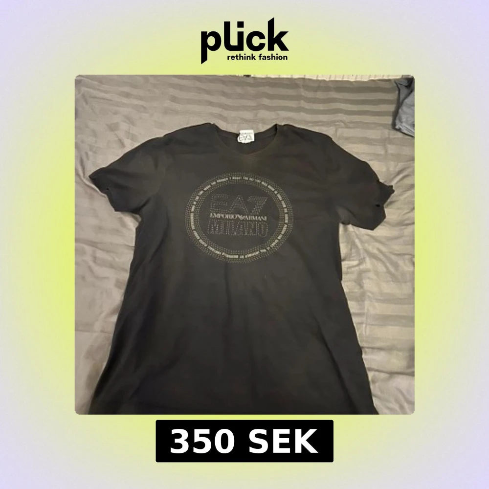 Svart t-shirt från EA7 Emporio Armani med rund hals och korta ärmar. Framsidan har ett stort, cirkulärt tryck med texten 'EA7 Emporio Armani Milano' i silverfärgade detaljer. Materialet känns mjukt och är troligtvis bomull, perfekt för en clean och stilren look.