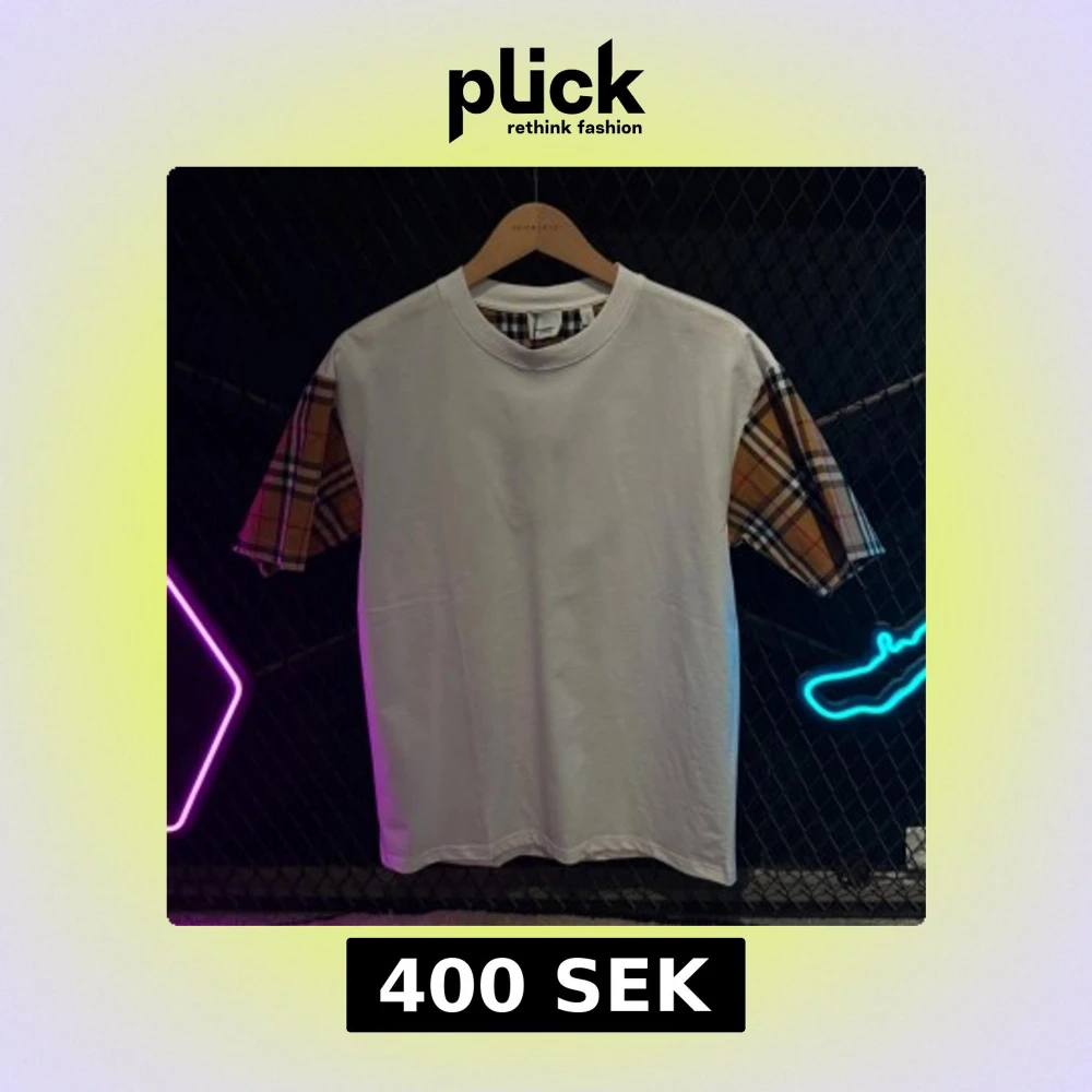 Snygg vit t-shirt med unika rutiga ärmar i brunt, svart och beige. Perfekt för en trendig look. Den har en klassisk rund hals och korta ärmar som ger en stilren touch.