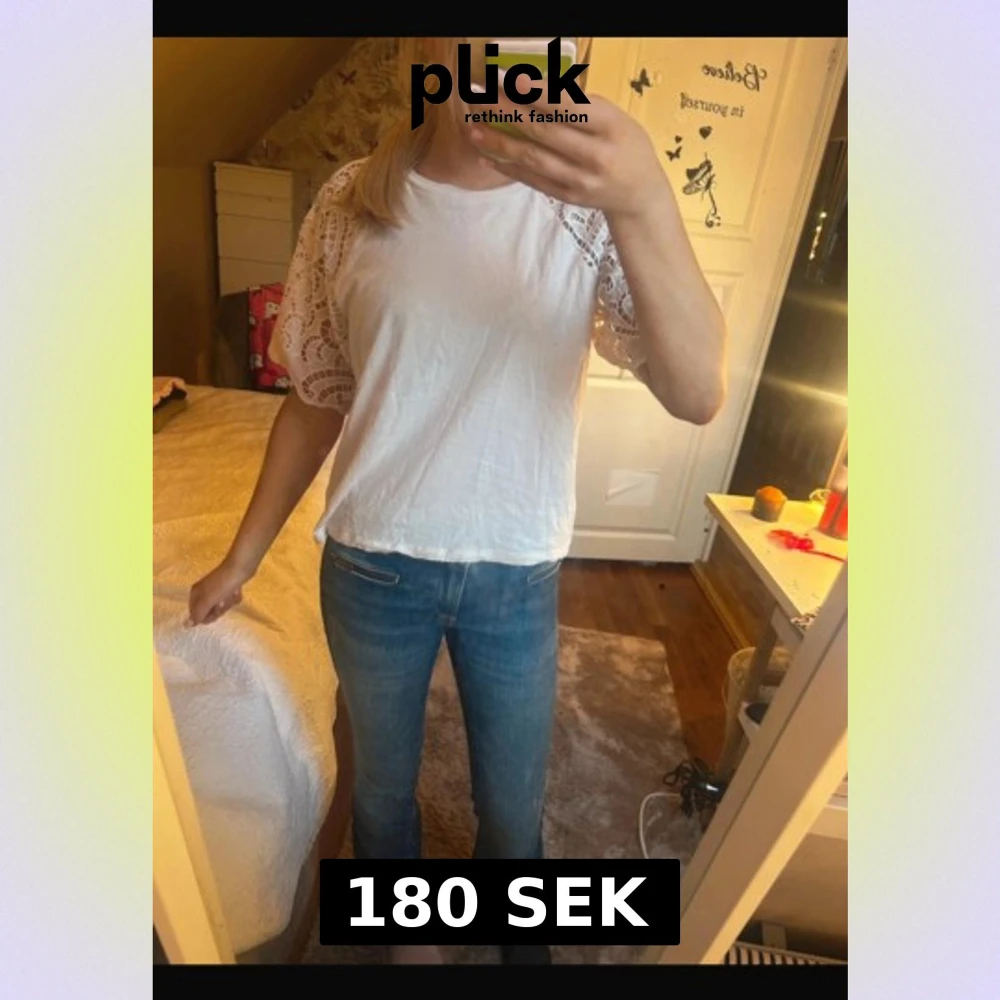 Vit blus från LOW VISION i storlek S. Toppen har korta, vida ärmar i vacker spets och en rak passform. Perfekt för dig som gillar en söt och stilren look med det lilla extra i ärmdetaljerna.