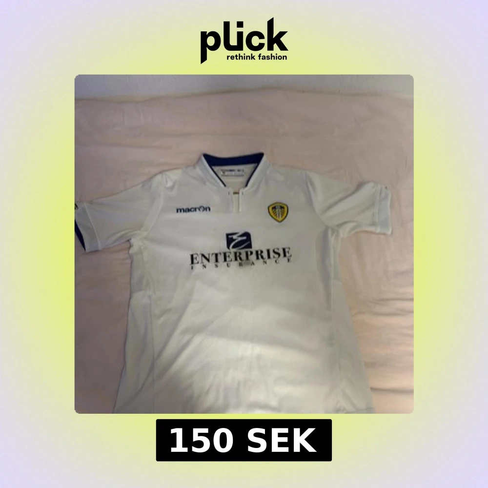 Säljer en vit fotbollströja från Macron med Leeds Uniteds emblem på bröstet. Tröjan har korta ärmar och en klassisk krage med blå detaljer. Den har tryck av Enterprise Insurance på framsidan och Help-Link Home på baksidan. Perfekt för fotbollsfans!
