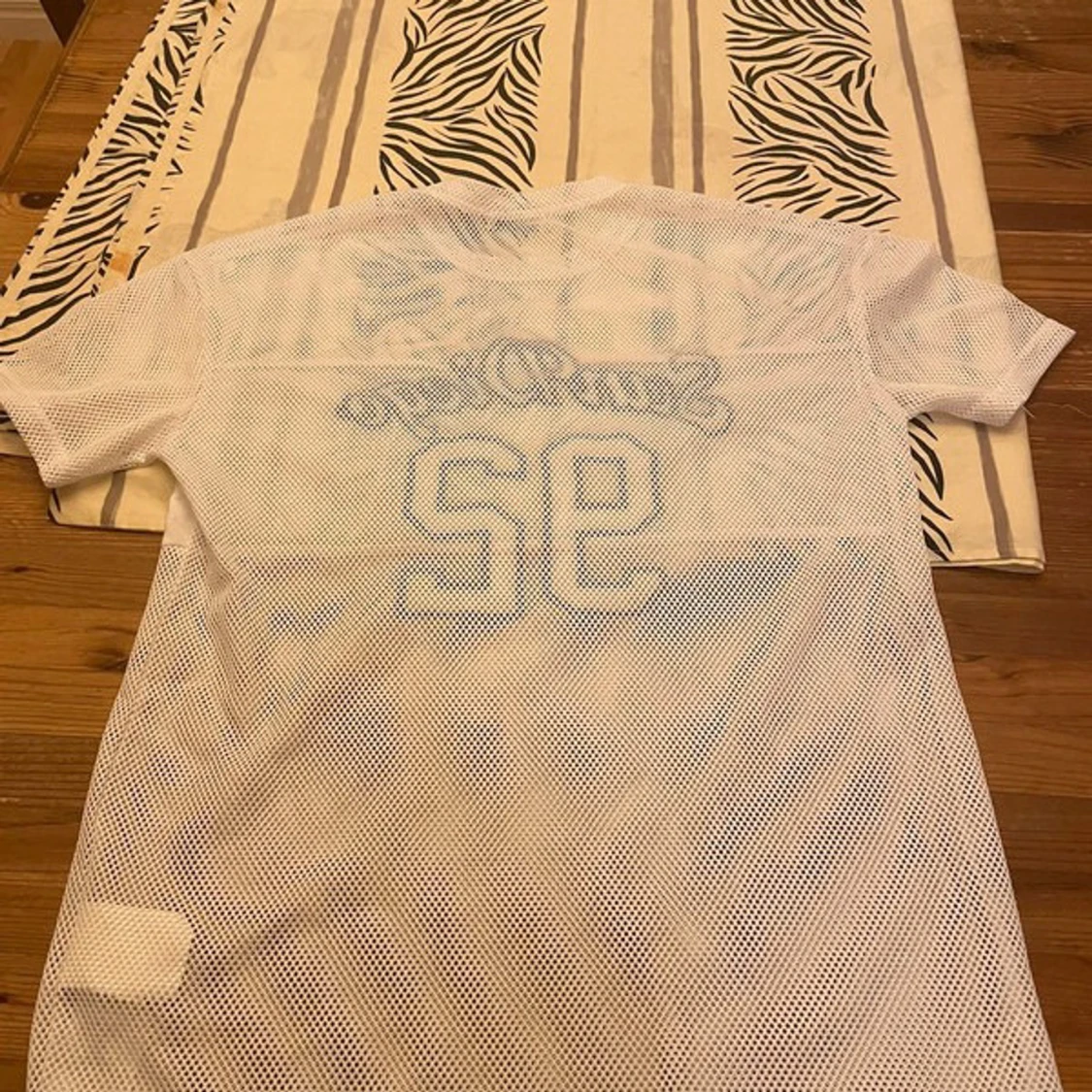 Vit mesh t-shirt från FB Sister med trycket 'San Diego 92' på bröstet. Oversized känsla, kortärmad och tillverkad i luftig polyester. Perfekt för en sportig och trendig look.