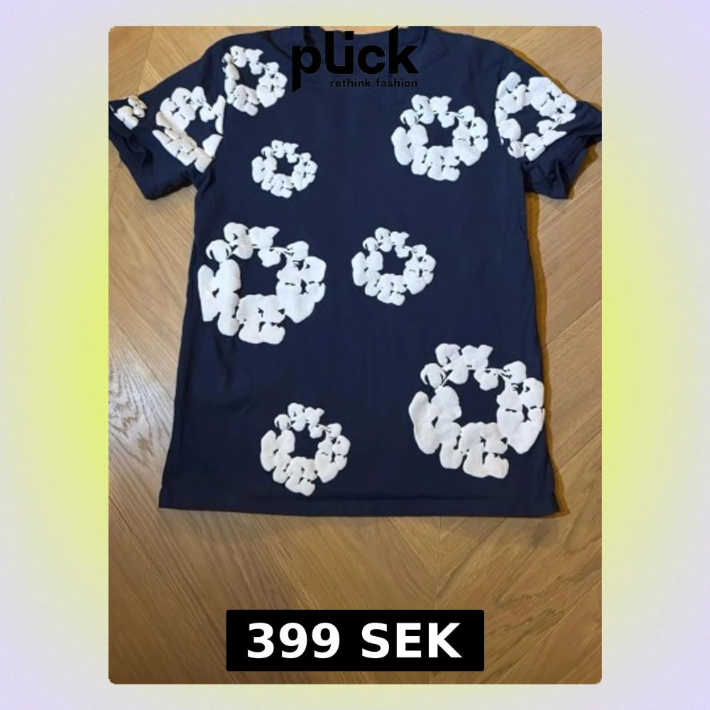 Säljer en mörkblå t-shirt med coola vita blommönster över hela plagget. T-shirten har korta ärmar och är gjord i mjuk bomull som känns skön mot huden. Perfekt för dig som gillar unika prints och vill sticka ut lite extra.