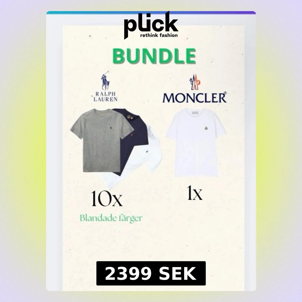 Säljer ett paket med 10 t-shirts från Ralph Lauren och 1 t-shirt från Moncler. T-shirtsen är i blandade färger som grå, vit och mörkgrå, alla med klassisk logga på bröstet. De är kortärmade och i mjuk bomull, perfekt för en clean och stilren look.