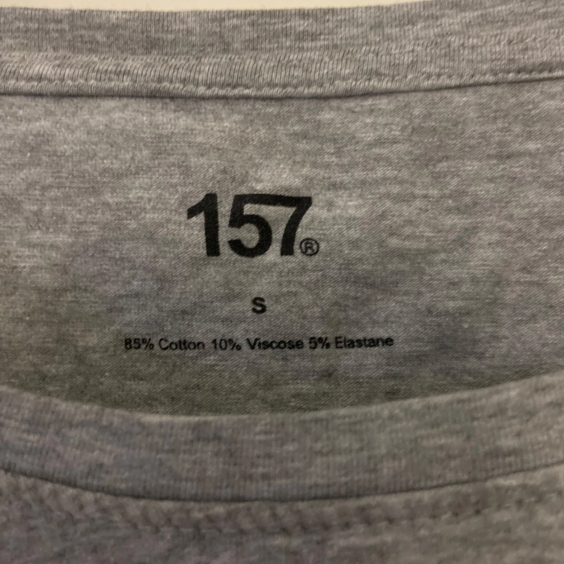 Säljer en enkel och stilren grå t-shirt från 157. Den är kortärmad och tillverkad i en mjuk bomullsblandning för extra komfort. Perfekt för en avslappnad look.