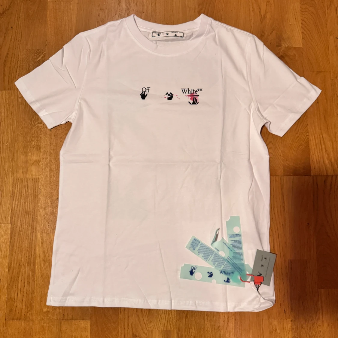Vit t-shirt från Off-White med coolt grafiskt tryck i svart och rött på ryggen och mindre tryck framtill. Klassisk rund hals och korta ärmar. Materialet är mjuk bomull och passformen är normal. Perfekt för dig som gillar streetwear och snygga detaljer.