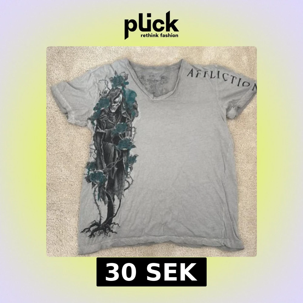 Snygg grå t-shirt från Affliction med v-ringning och korta ärmar. Framsidan har ett stort tryck med dödskalle och mörka rosor i svart och turkos. På axeln står 'Affliction' tryckt i svart. Baksidan har ett svart emblem upptill. Materialet är mjuk bomull.