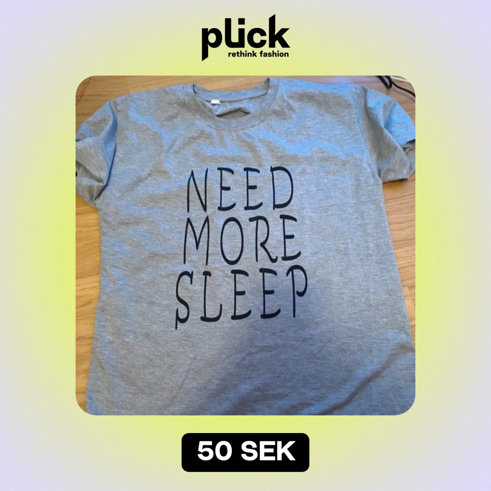 Säljer en grå t-shirt med texten 'NEED MORE SLEEP' i svart. Perfekt för en avslappnad stil eller som en rolig present. T-shirten är i bomull och har en normal passform med korta ärmar. Perfekt för vardagsbruk eller som en pyjamastopp.