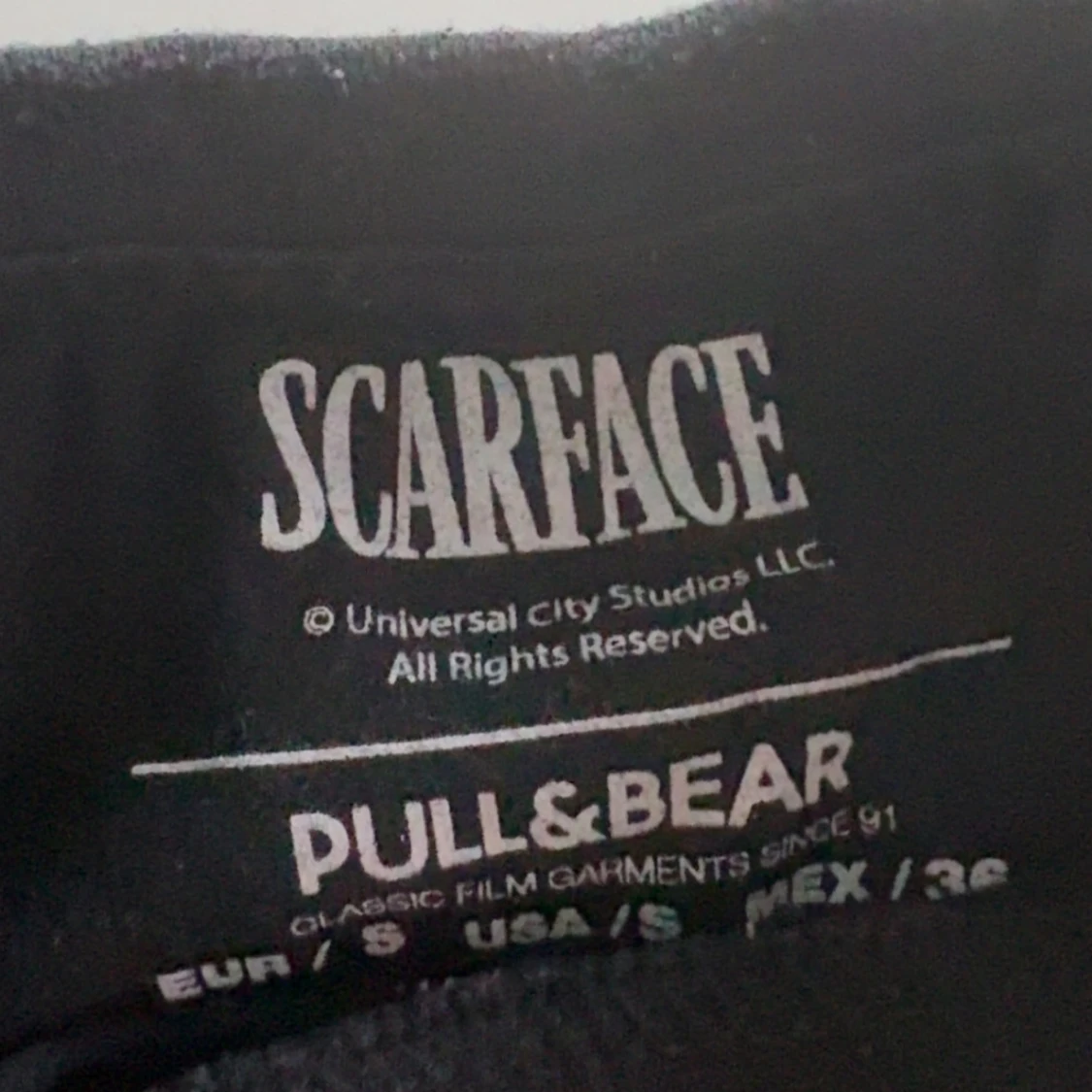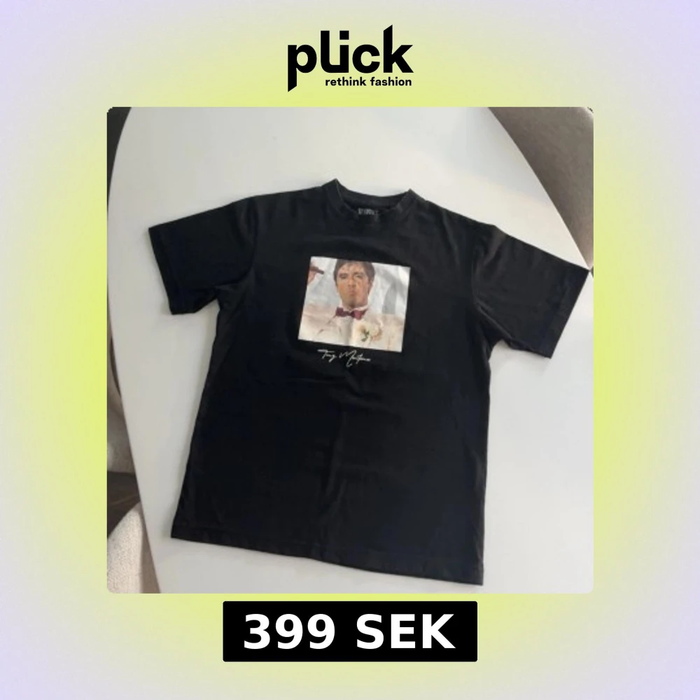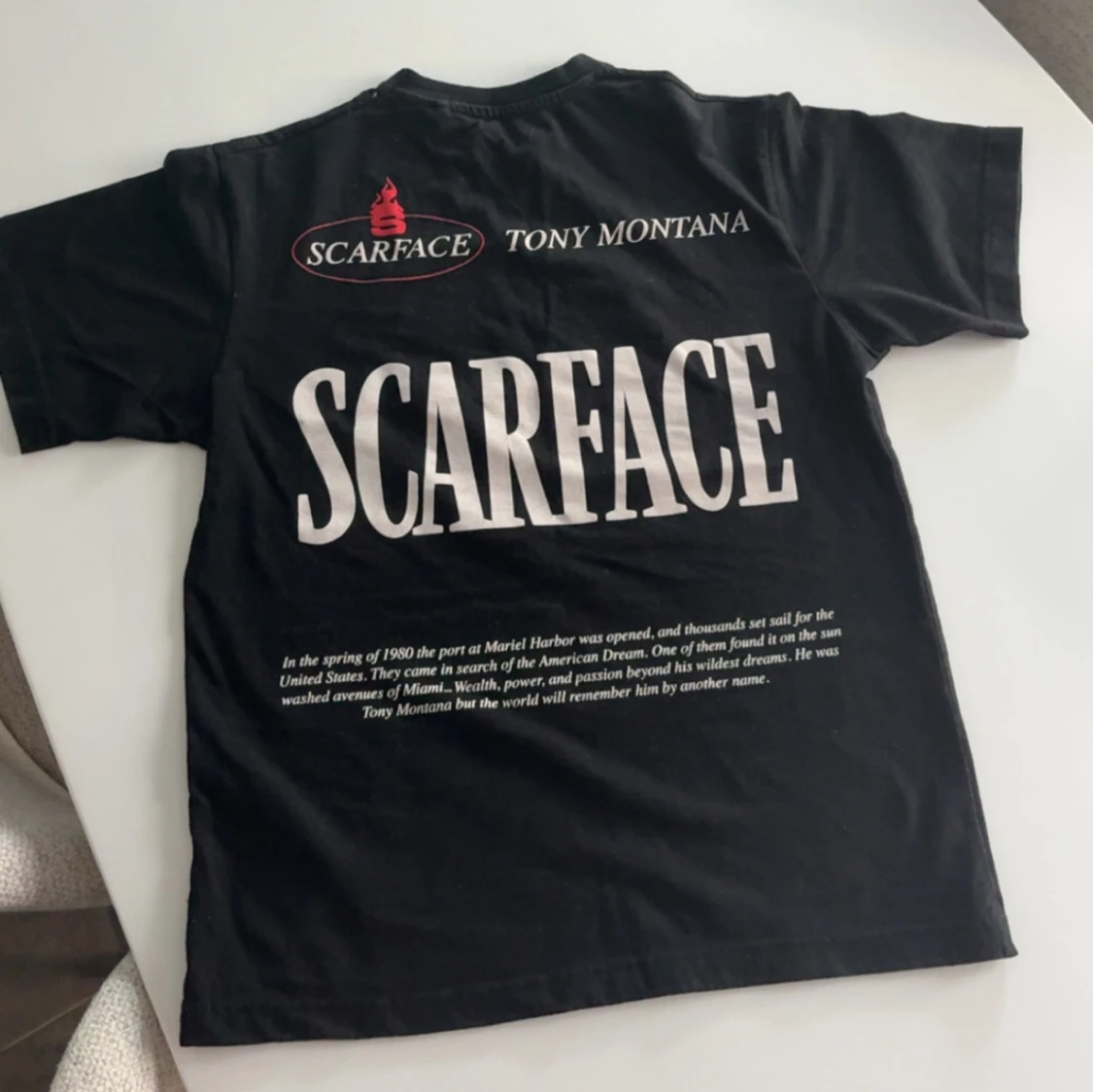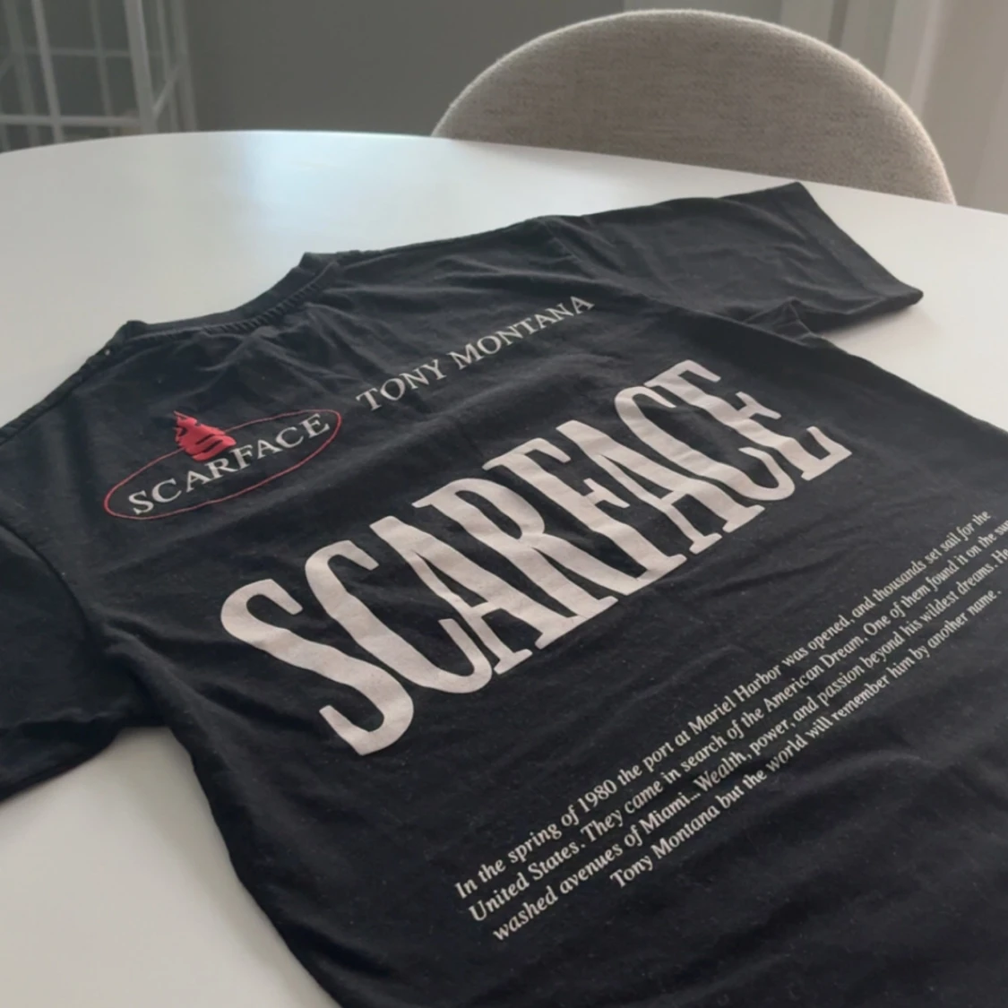 Snygg svart T-shirt med ikoniskt Scarface-motiv. Köpt i Spanien och knappt tillgänglig i Sverige, vilket gör den till ett unikt fynd för fans av klassikern! ✅ Storlek: [S] ✅ Skick: Som ny, endast provad/använd ett fåtal gånger ✅ Material Perfekt för dig som gillar retrofilm, streetwear eller vill ha något som inte alla andra har!