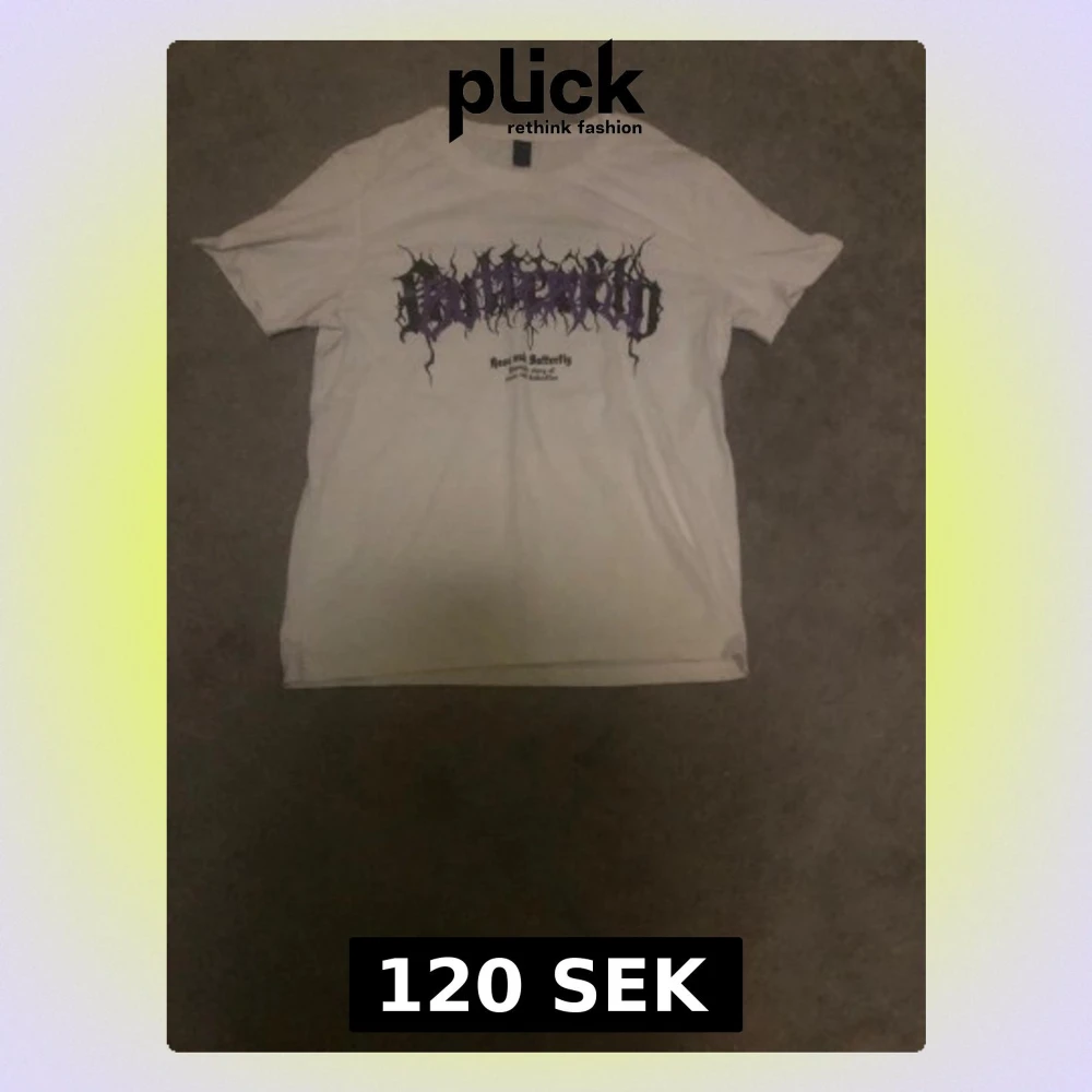 Vit t-shirt från Romwe i storlek S med stort lila och svart tryck på framsidan. Trycket har texten 'Butterfly' i gotisk stil och motiv av fjärilar och rosor. Klassisk rund hals och korta ärmar. Skön och mjuk bomullskänsla.