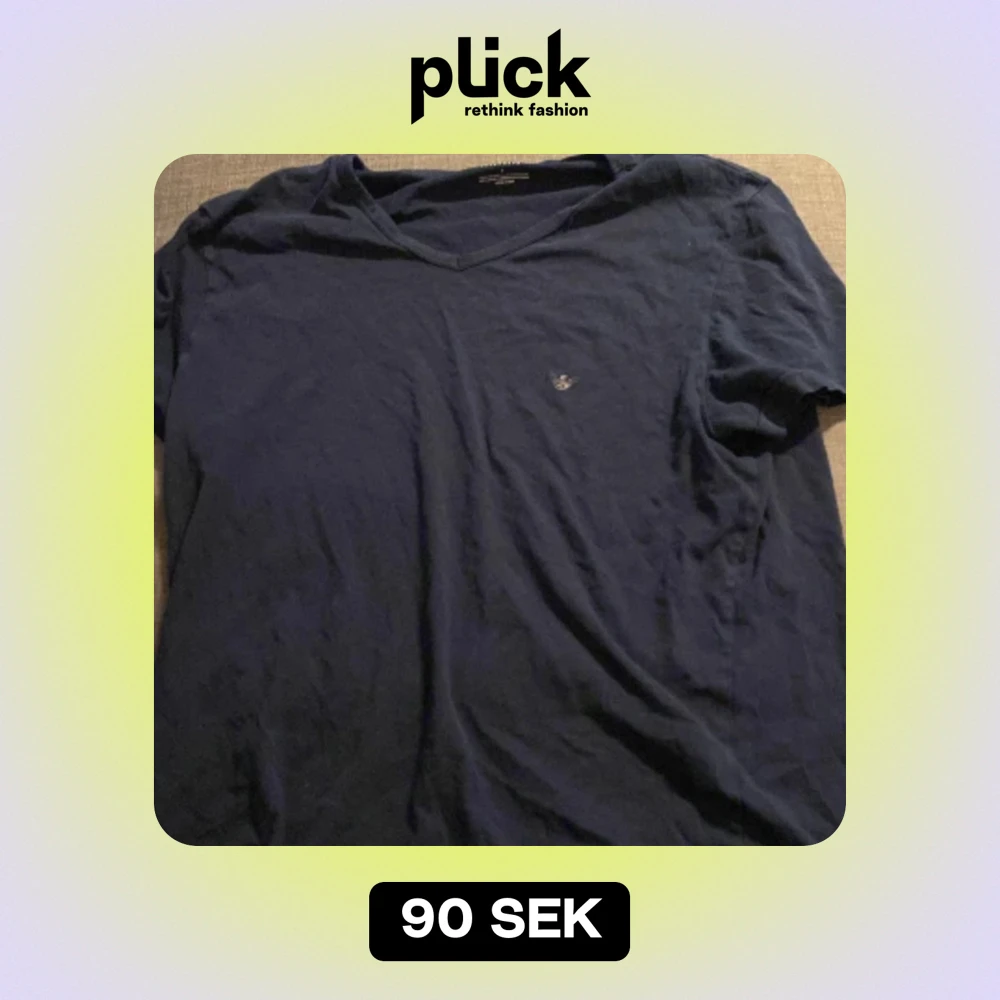 Säljer en mörkblå t-shirt med v-ringning. Den är kortärmad och har en liten broderad logga på bröstet. Perfekt för en avslappnad stil!