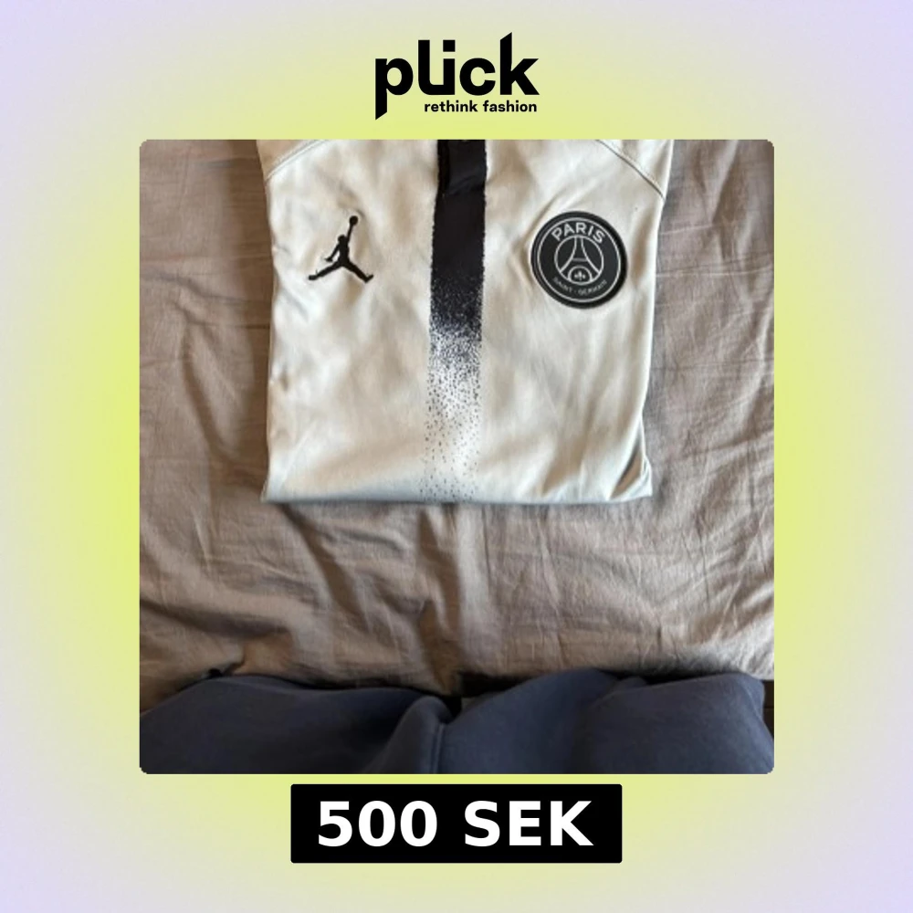 Snygg vit PSG fotbollströja i samarbete med Jordan. Tröjan har svart vertikal rand i mitten, PSG-logga på bröstet och klassiska Jumpman-loggan. Tillverkad i lätt och ventilerande material, perfekt för träning eller match. Svarta detaljer vid ärmslut.