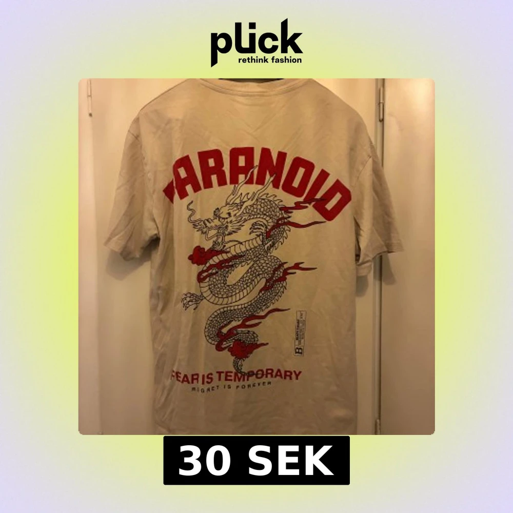 Beige t-shirt med stort rött drakmotiv på ryggen. Strl S (oversized)