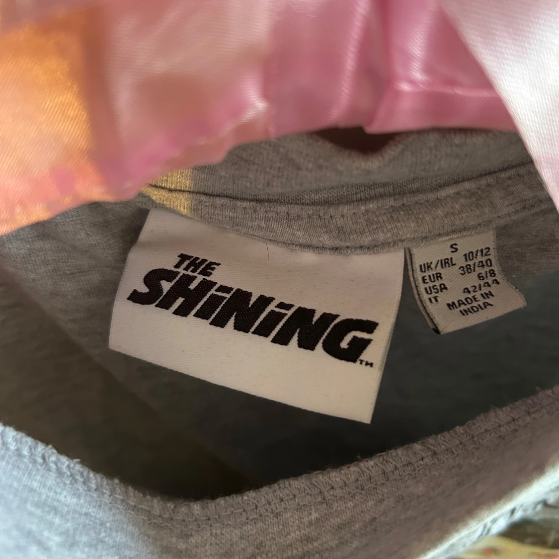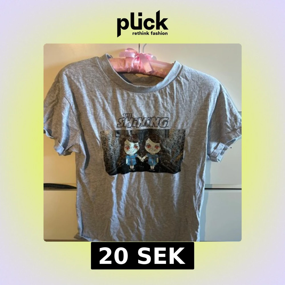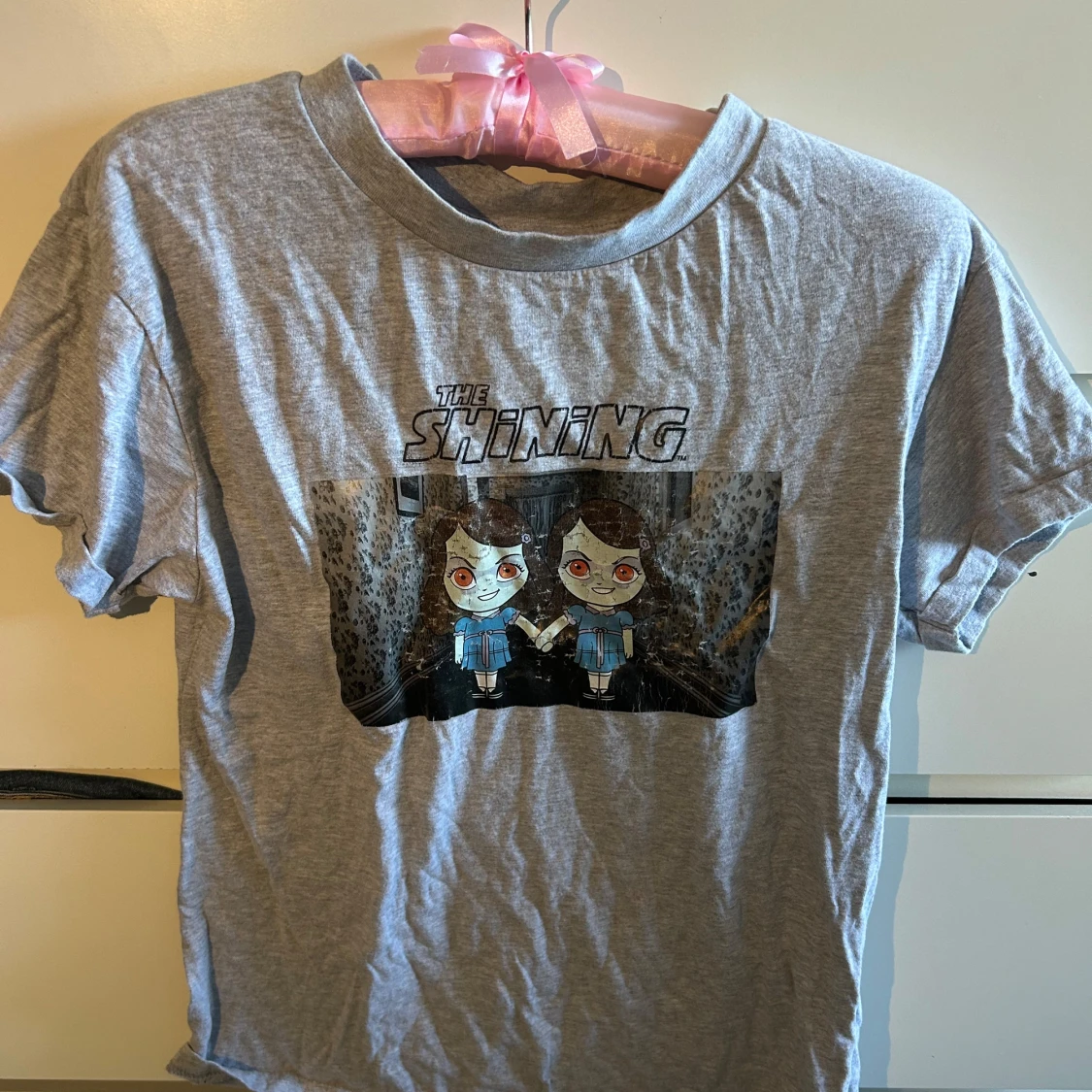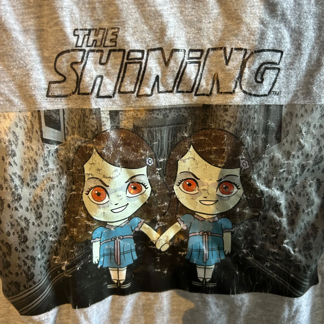 Grå t-shirt med coolt The Shining-tryck framtill som visar de ikoniska tvillingarna i tecknad stil. Klassisk passform med rund hals och korta ärmar. Perfekt för dig som älskar skräckfilmer och vill sticka ut med en unik look.
