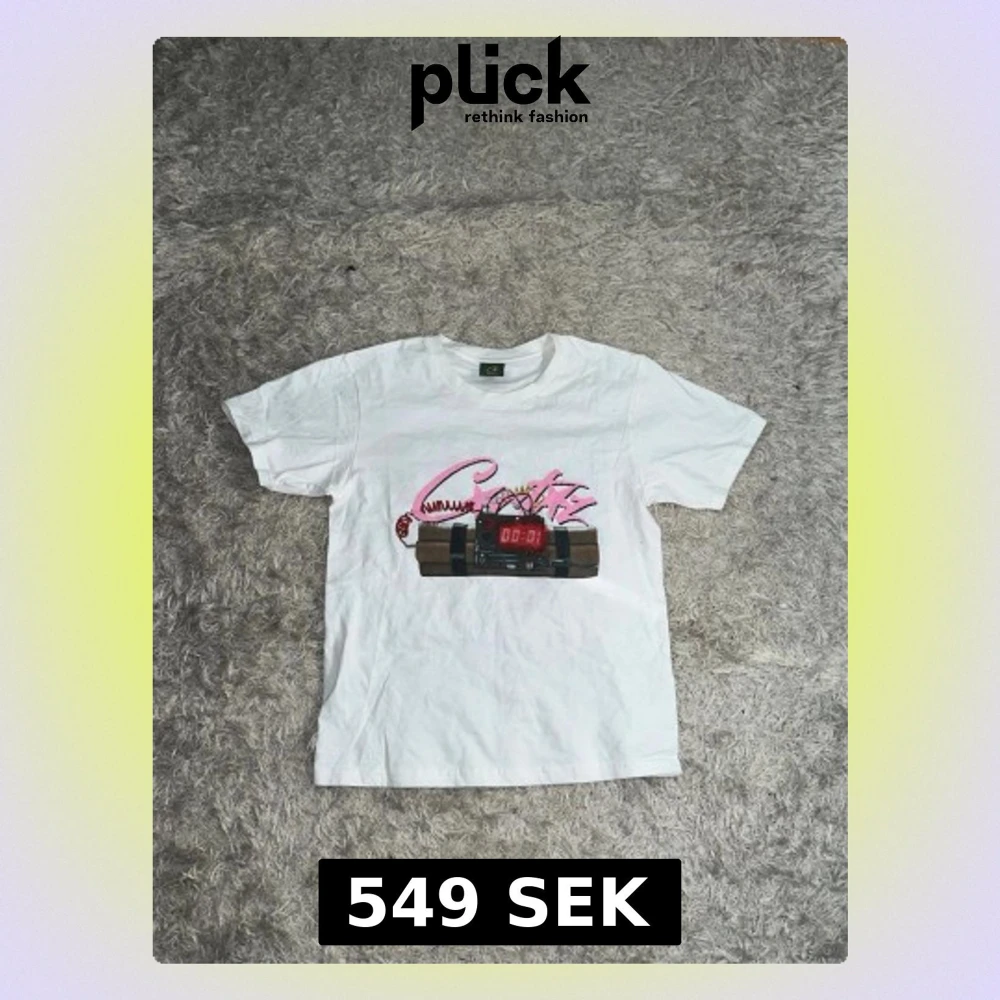Vit corteiz t-shirt med färgglatt tryck av en bomb med digital klocka och rosa text på framsidan. På baksidan står det 'NO TIME 4 LUV' i stora svarta bokstäver. Klassisk passform och rund hals, perfekt för dig som gillar statement-plagg. För fler frågor/bilder skriv privat.