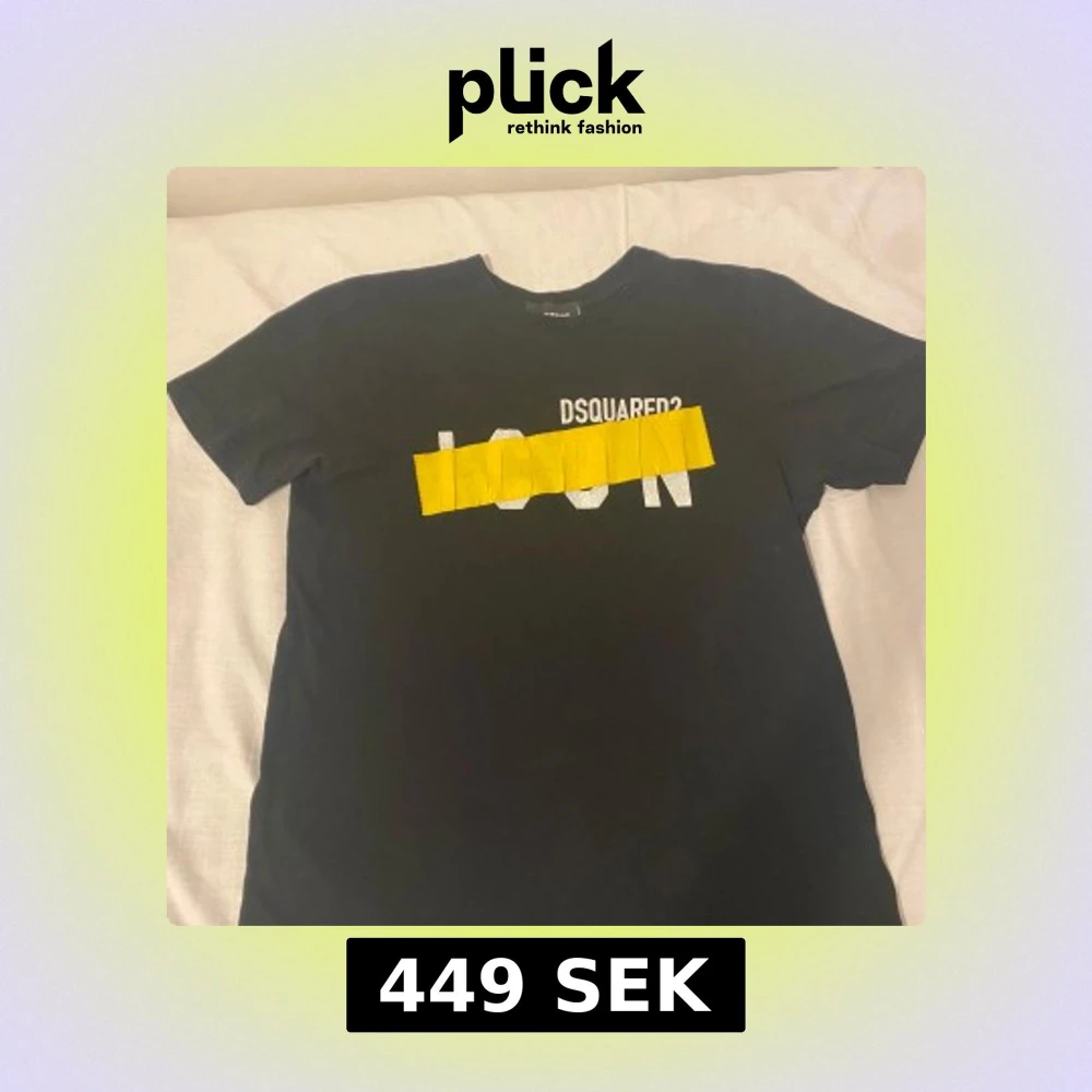 Svart t-shirt från DSQUARED2 i storlek S med vit och gul tryckt ICON-logga på bröstet. Klassisk rund hals och korta ärmar. Materialet är mjuk bomull som känns skön mot huden. Perfekt statement-plagg med cool design och snygg passform.
