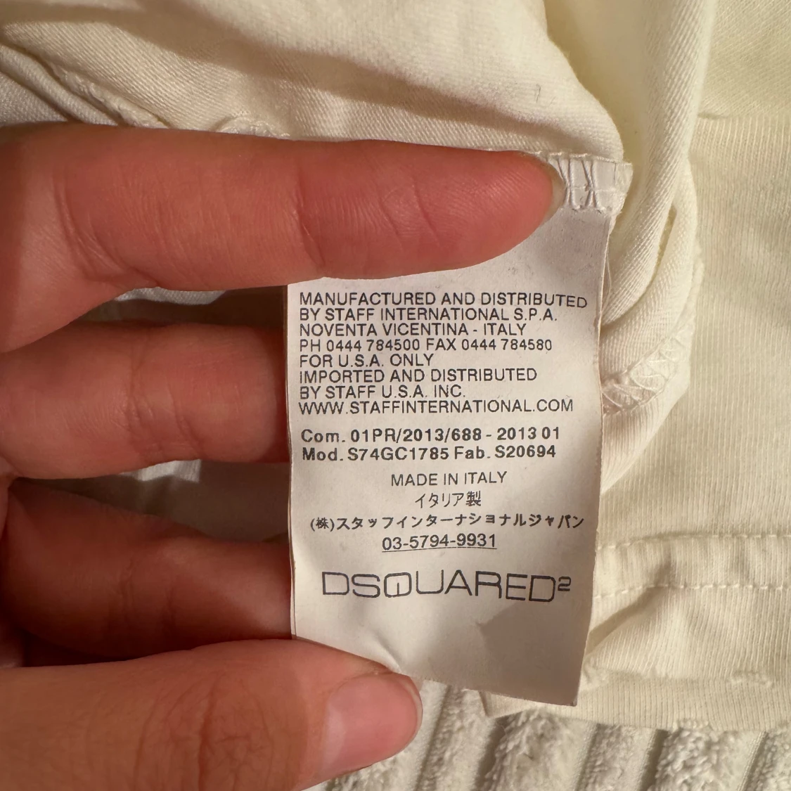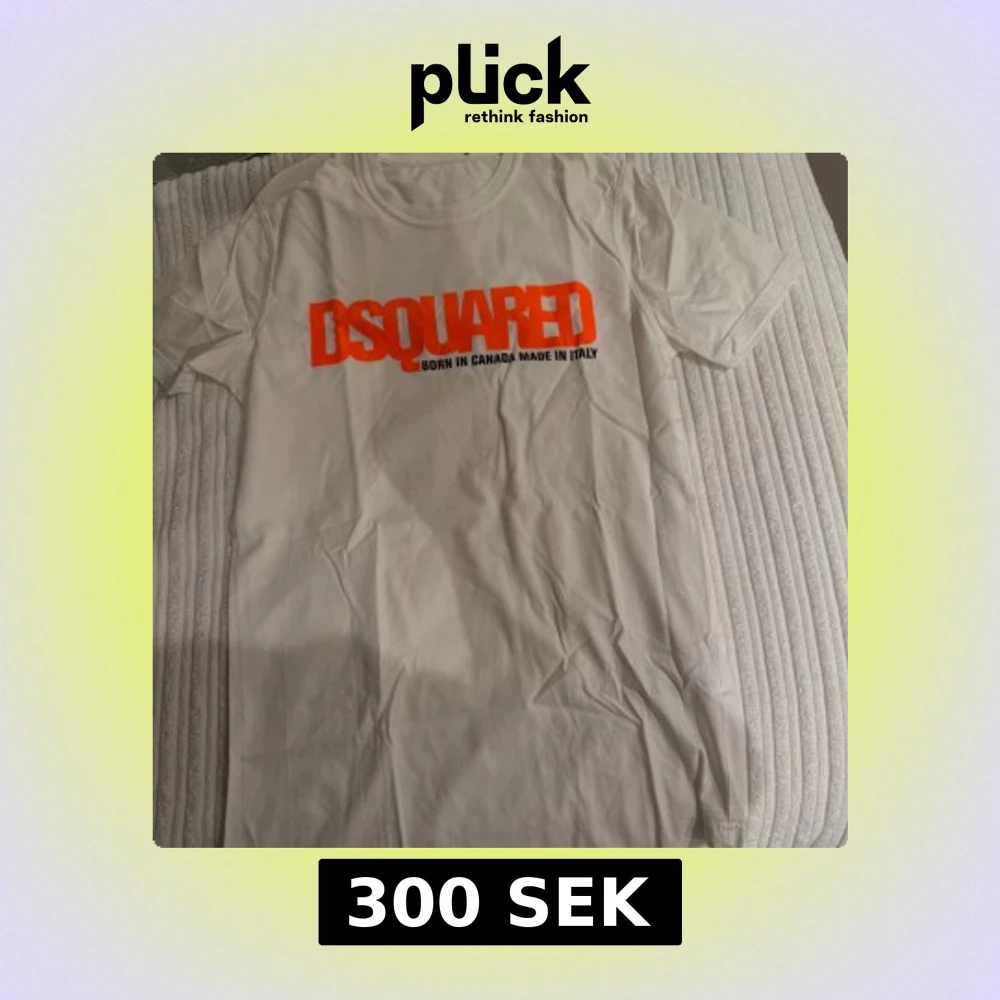 Säljer en vit t-shirt från Dsquared2 med en iögonfallande orange logga på bröstet. Tillverkad i Italien med texten 'Born in Canada Made in Italy' under loggan. Perfekt för en stilren och modern look. Nexktag har fallit av , äkta dsquared2!