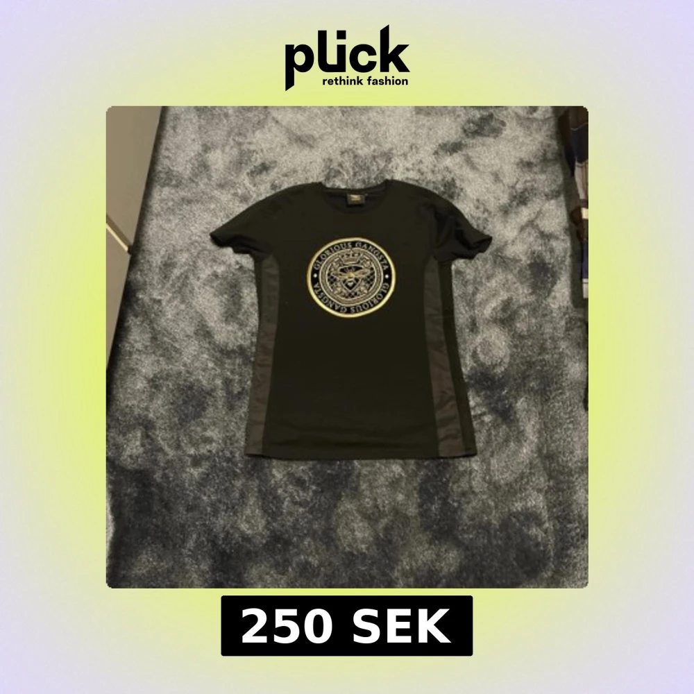 Snygg svart t-shirt från Glorious Gangsta med ett stort, guldigt emblem på bröstet. T-shirten har korta ärmar och en normal passform. Perfekt för en stilren look. och den är xs men passar som S.