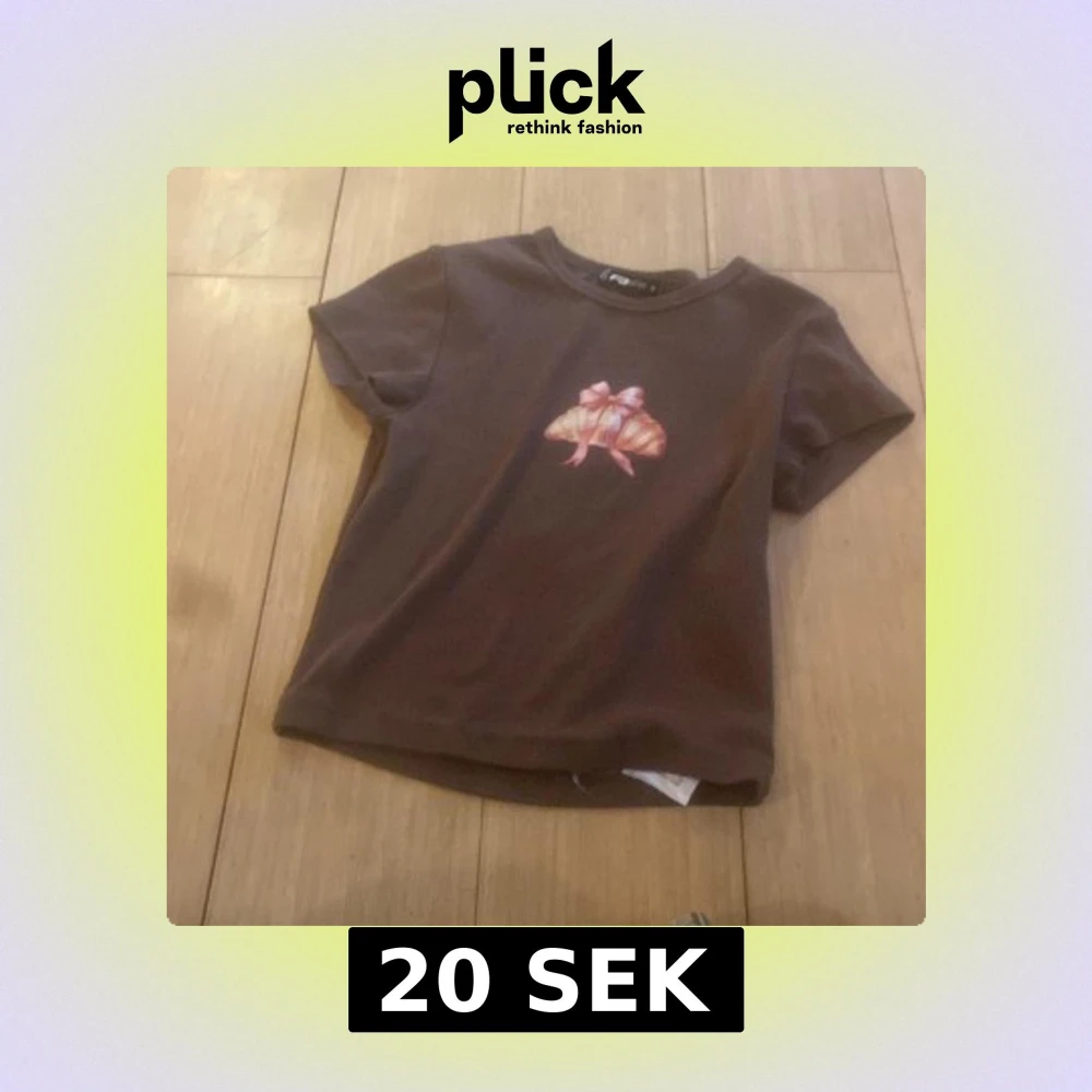 Söt brun t-shirt från FB Sister i storlek S. Framsidan har ett tryck av en croissant med rosa rosett. Klassisk rund halsringning och korta ärmar. Perfekt för dig som gillar unika och lekfulla prints.