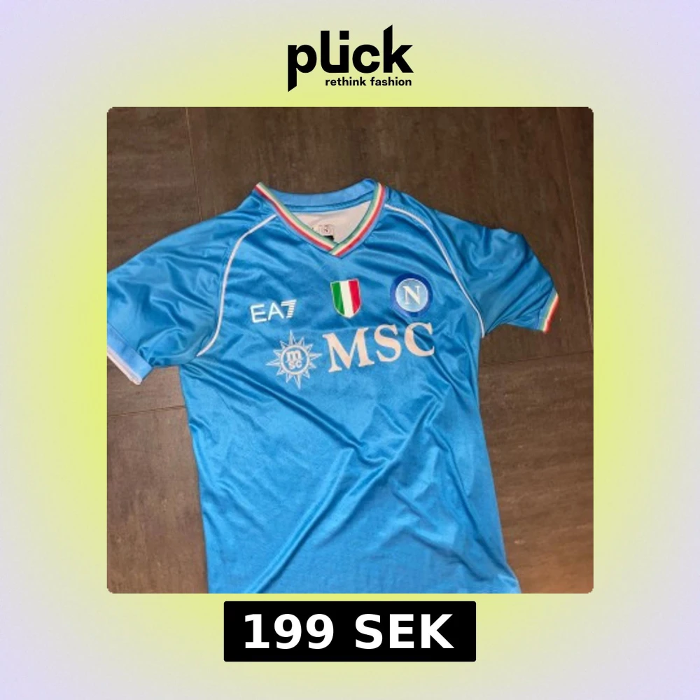 Snygg blå Napoli fotbollströja från EA7 med korta ärmar och nummer 77 på ryggen. Tröjan har klubbens emblem och sponsorloggor på framsidan samt italienska flaggans färger vid kragen.