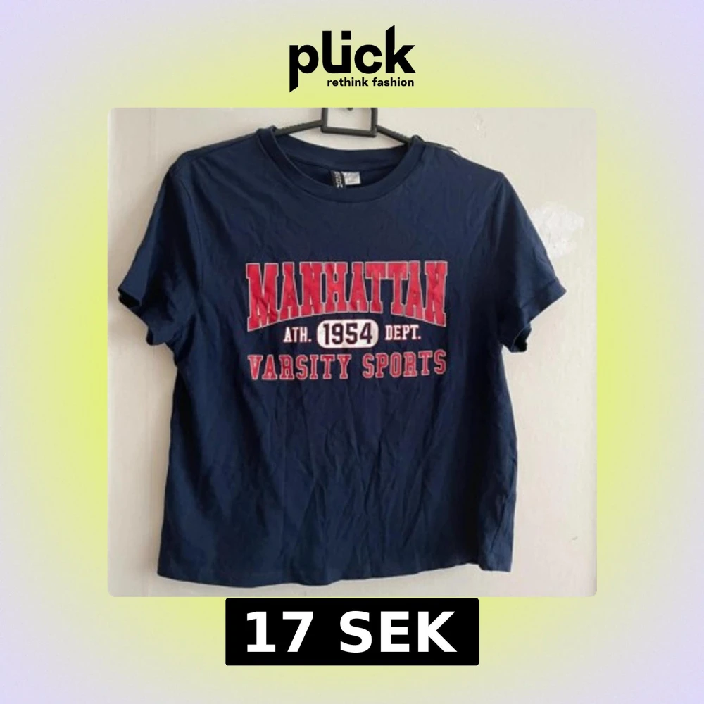 Säljer en mörkblå t-shirt från Divided med tryck 'Manhattan Varsity Sports' i rött och vitt. T-shirten har en klassisk rund hals och korta ärmar. Perfekt för en sportig look!