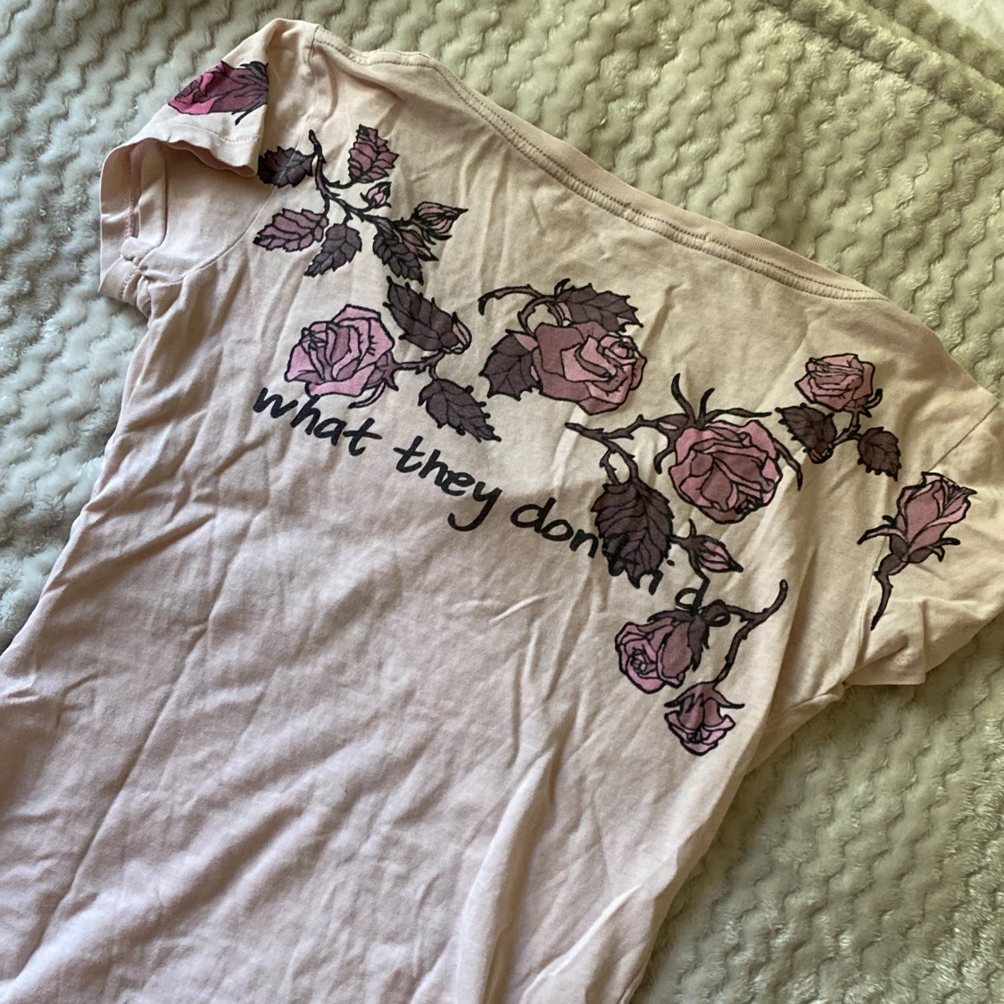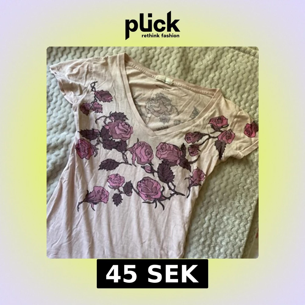 Snygg ljusrosa t-shirt med v-ringning och korta ärmar. Framsidan och baksidan har tryck av rosa och lila rosor. T-shirten är i mjuk bomull och har en avslappnad passform, perfekt för en chill look.