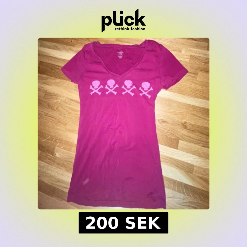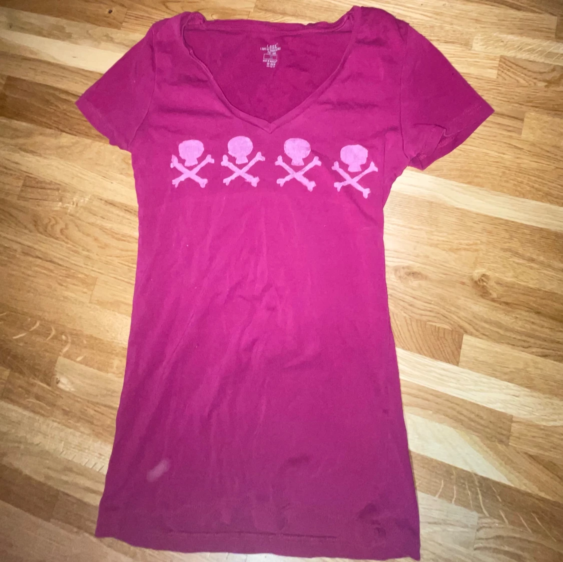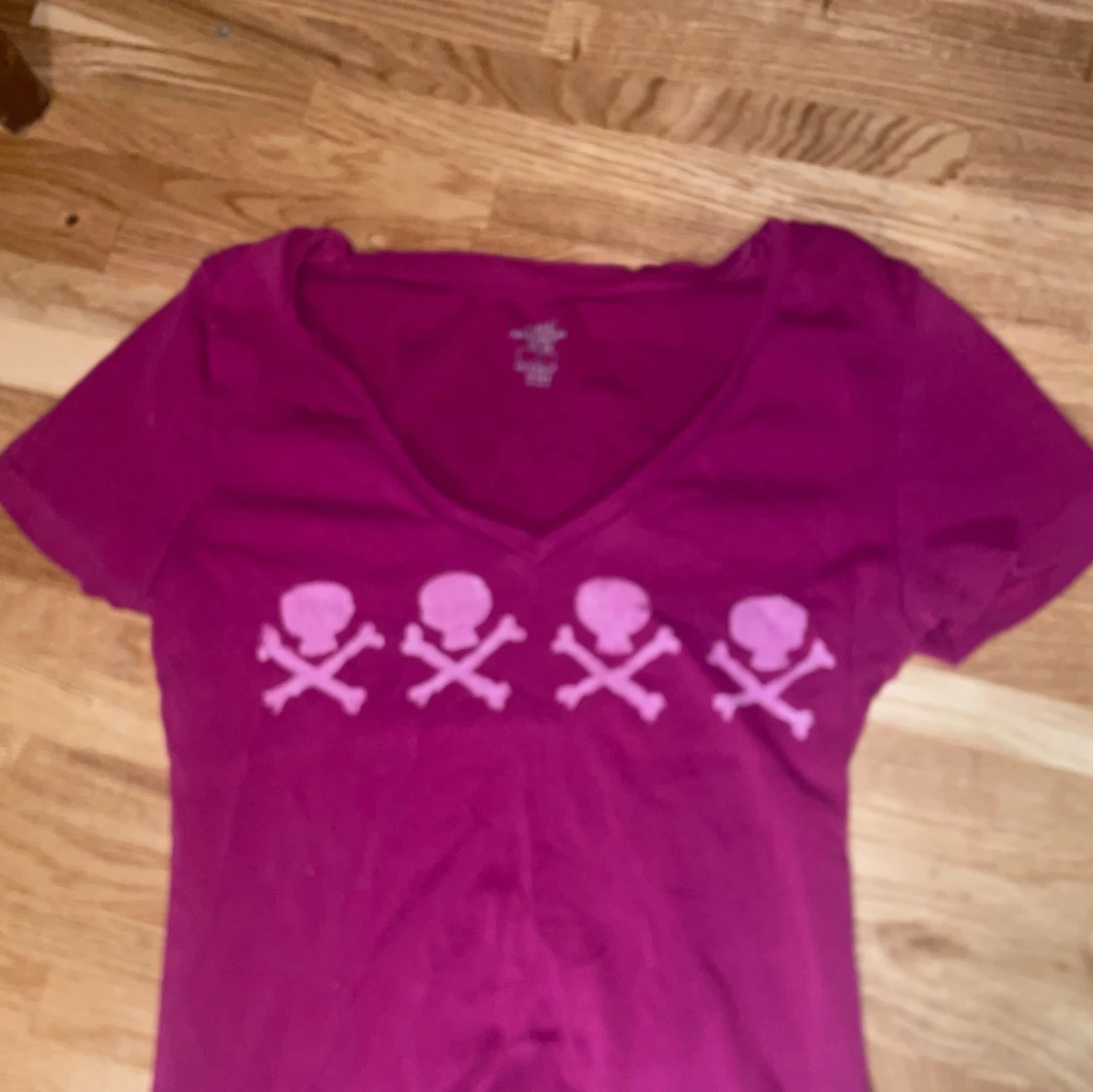 Rosa/lila T-shirt med dödskallar över bröstet (gjort själv, håller i tvätten), står S men stretchig så passar XS och M också