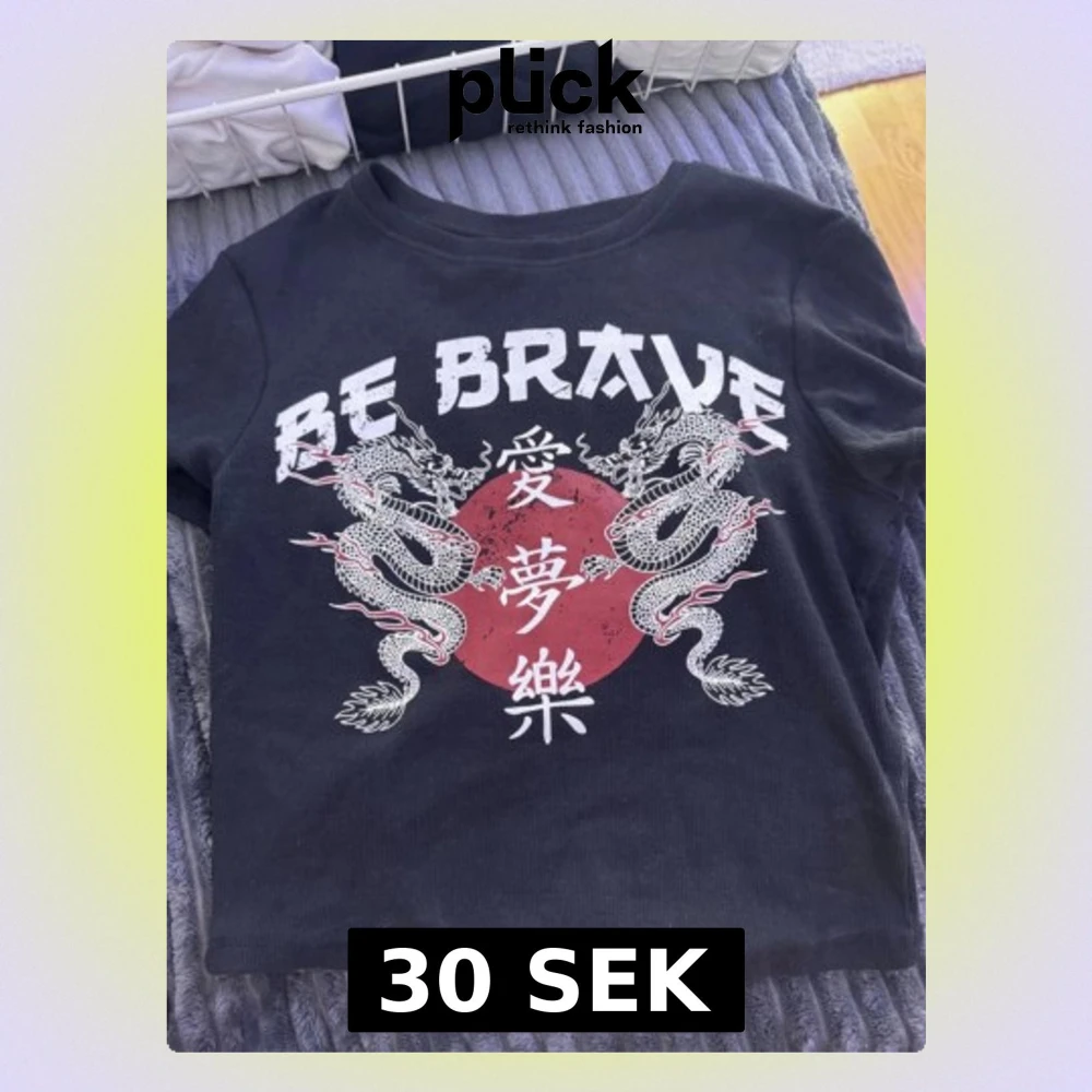 Cool svart t-shirt med tryck av två vita drakar, röd cirkel och asiatiska tecken. Texten 'BE BRAVE' syns över motivet. T-shirten har korta ärmar och en klassisk rund hals. Perfekt för dig som gillar streetstyle och grafiska prints.
