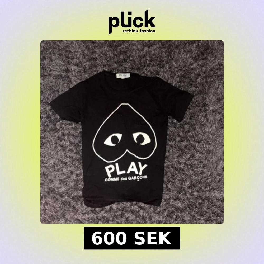 Svart t-shirt från Comme des Garçons Play i storlek S. Stor vit logga med ögon och text på bröstet. Klassisk passform med rund hals och korta ärmar. Perfekt för dig som gillar streetwear och vill sticka ut med en ikonisk design. Passar dig som är ungefär 170