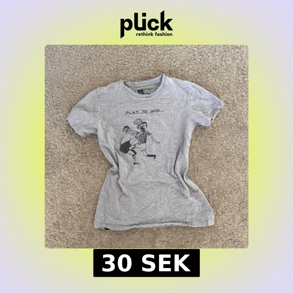Säljer en grå t-shirt från Dedicated med trycket 'Play to Win' och en tecknad fotbollsscen. Gjord av 100% ekologisk och Fairtrade-certifierad bomull.