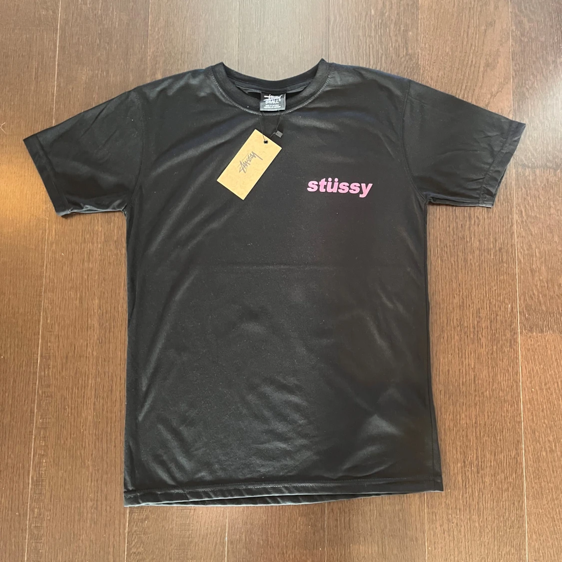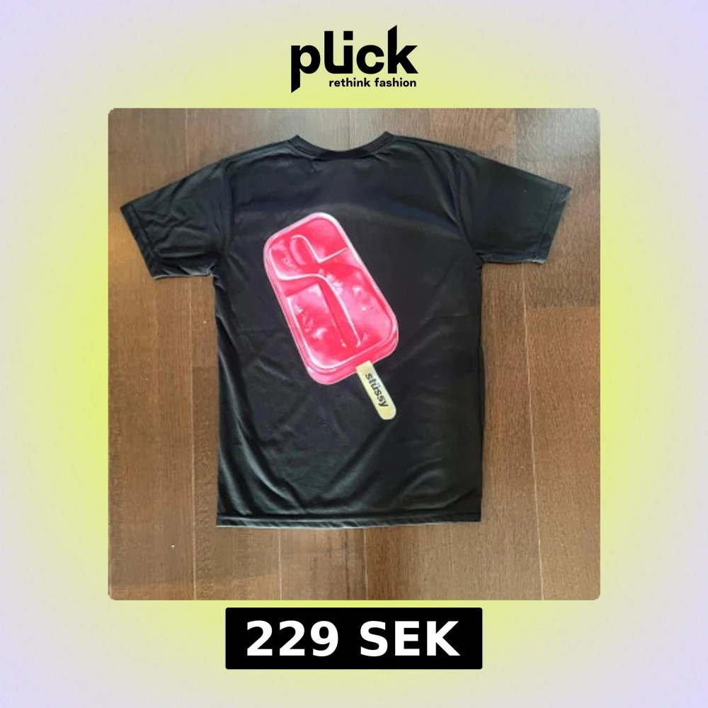 Svart t-shirt från Stüssy med kort ärm. På bröstet finns ett rosa Stüssy-tryck och på ryggen ett stort tryck av en röd glasspinne med Stüssy-logga på pinnen. Perfekt för dig som gillar streetwear och coola prints.