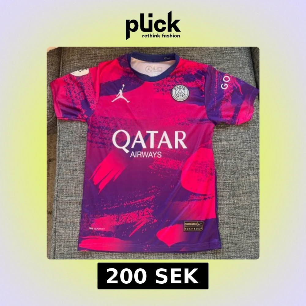 Snygg PSG fotbollströja med Mbappé 7 på ryggen. Tröjan har ett unikt mönster i rosa och mörklila med vita detaljer och loggor. Tillverkad i lätt och ventilerande material, perfekt för träning eller match. Officiell Jordan x PSG design med Qatar Airways tryck.
