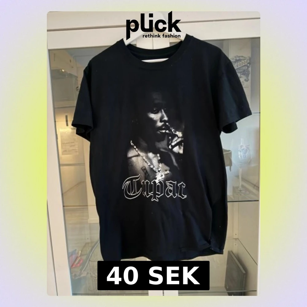 Cool svart t-shirt med stort tryck av Tupac på framsidan och text i vit gotisk stil. Klassisk passform och rund halsringning, perfekt för dig som gillar streetwear och hiphop. Materialet känns som bomull.